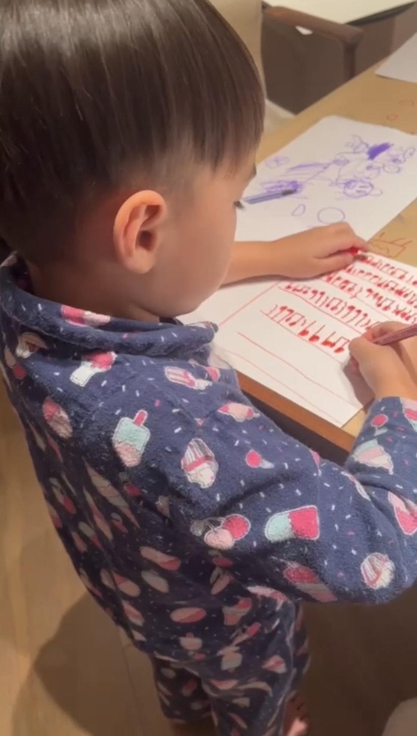 4歲Romeo在紙張上畫上一個又一個的音樂符號。