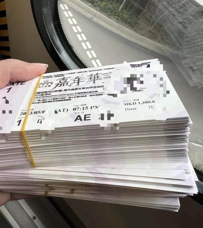 演唱會舉行在即,網上仍有大量黃牛門票出售,當中有不少人展示一疊疊的門票,聲稱是「靚位」及「真飛」,甚至附上紫外光燈照射下的防偽標誌,強調其手上的「黃牛」飛是正貨。其中最貴的$1,380門票索價近萬元,依然有不少人表示有興趣購入,當中包括大陸歌迷。