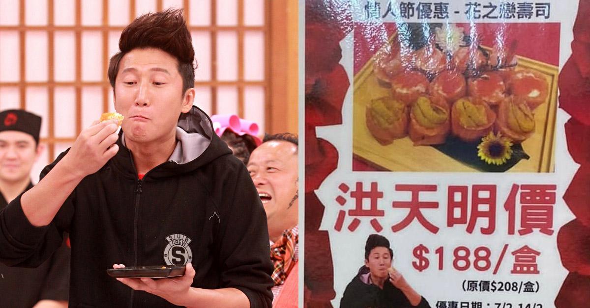 近日有店舖推出情人節優惠,表示一盒原價$208的花之戀壽司,現以「洪天明價」只需$188便可購得一盒,優惠期由本月7日至明天情人節為止。店舖的優惠吸引到網民注意,笑言每次見到洪天明便會想起花之戀壽司。