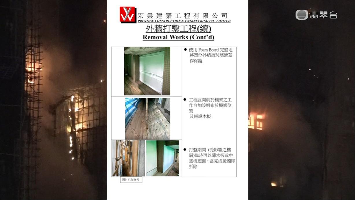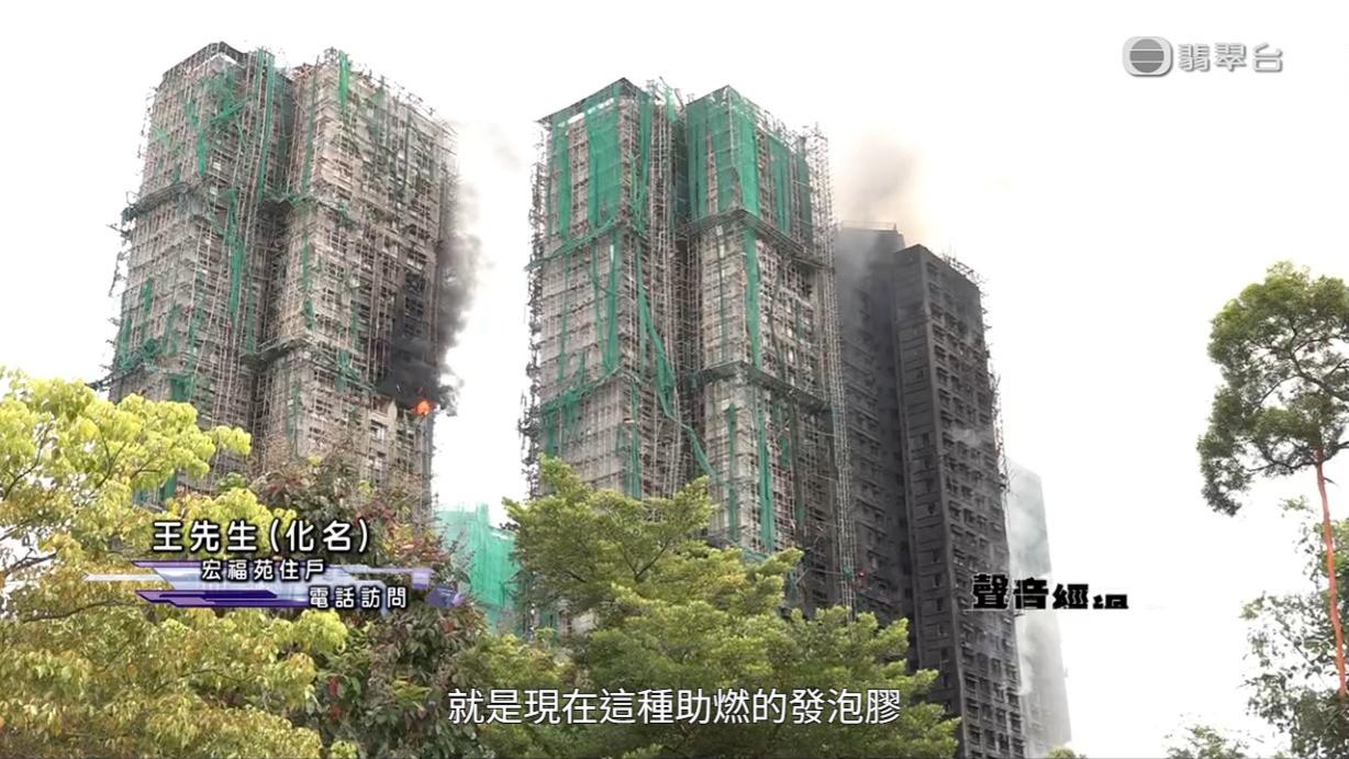 大埔宏福苑昨日(26日)發生五級火,事件造成多人傷亡,1名消防員殉職。7幢起火大廈正進行搭棚工程,外牆的建造物料懷疑未符防火標準,負責維修的工程公司3名負責人被捕。警方發現一座未波及的大廈,每層電梯大堂窗外都有發泡膠包封,易燃及可能加速火勢蔓延,不排除發泡膠是迅速蔓延的原因,相關物料由一間工程公司負責安裝。今晚《東張西望》除了播出受影響住戶情況外,及探討保險賠償,亦有聚焦在發泡膠封窗和棚網。