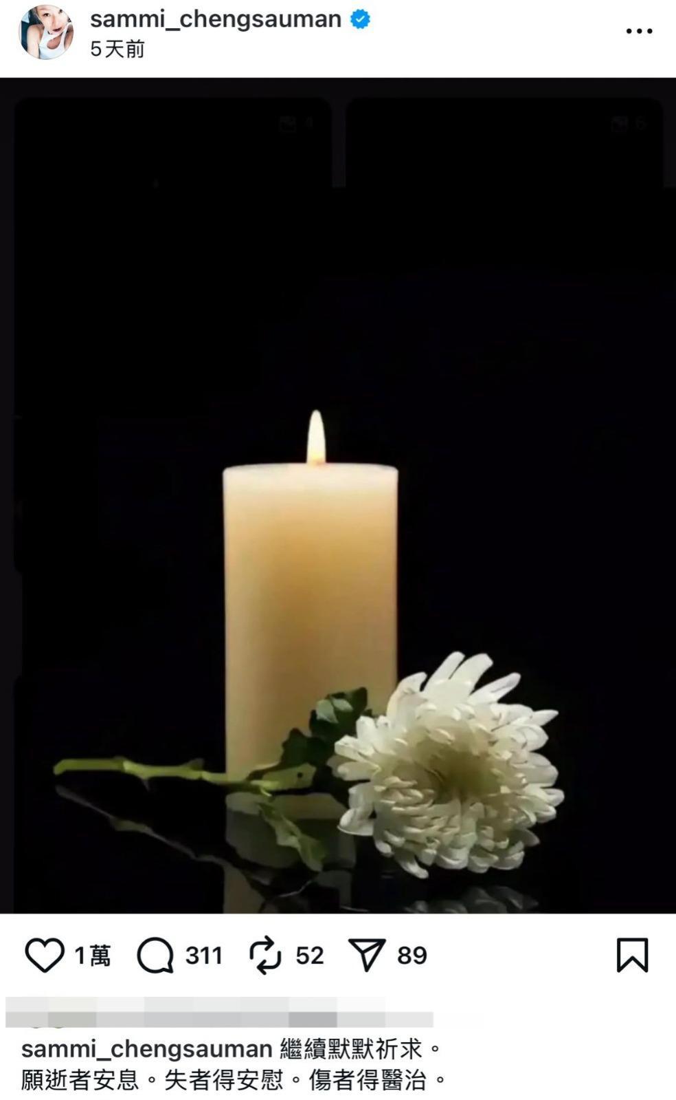 近日大埔宏福苑發生嚴重火警,事件受到全城關注,過去的一星期有不少藝人以不同的方式去關心災民。鄭秀文 (Sammi) 日前發文指在事發初,因日以繼夜進行拍攝工作,自己卻在拍攝埸裏什麼都幫不到,感到非常難過慚愧,最後參加災民祈禱會與教友同心禱告。怎料,Sammi 的舉動卻惹來網民質疑,並質問她作為天后有否進行捐款。今日(4日) Sammi 再於社交網發長文澄清,並表示這段文字並非要挑起對罵,只是道出內心感受和說清事實,是平心氣和的表達,她更透露早在11月28日已向機構低調捐出100萬港元。