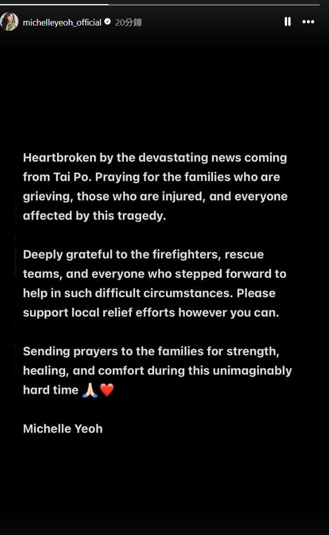 此外,楊紫瓊於香港時間今日下午更新社交網,她以黑底白字用英文寫:「Heartbroken by the devastating news coming from Tai Po. Praying for the families who are grieving, those who are injured, and everyone affected by this tragedy. Deeply grateful to the firefighters, rescue teams, and everyone who stepped forward to help in such difficult circumstances. Please support local relief efforts however you can. Sending prayers to the families for strength, healing, and comfort during this unimaginablyhard time.」楊紫瓊既為罹難者及家屬祈禱,亦留言感謝消防員及救援隊提供協助。