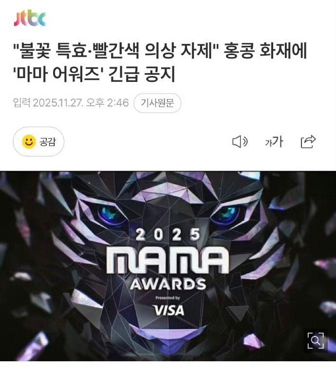 大埔宏福苑發生五級大火,韓國網民亦相當關注今次災難,認為在港舉行的MAMA頒獎禮應要取消,但主辦方經過慎重商議後,最終決定不會取消在香港舉行的MAMA頒獎禮,惟原定出席的周潤楊紫瓊已確定不會出席