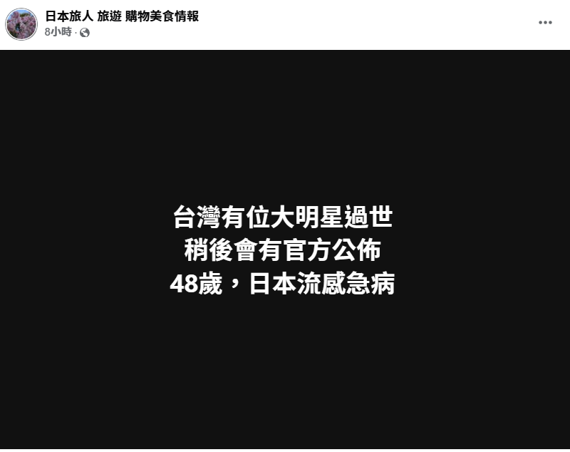 有專頁稱一名48歲台灣大明星死於日本流感急病。