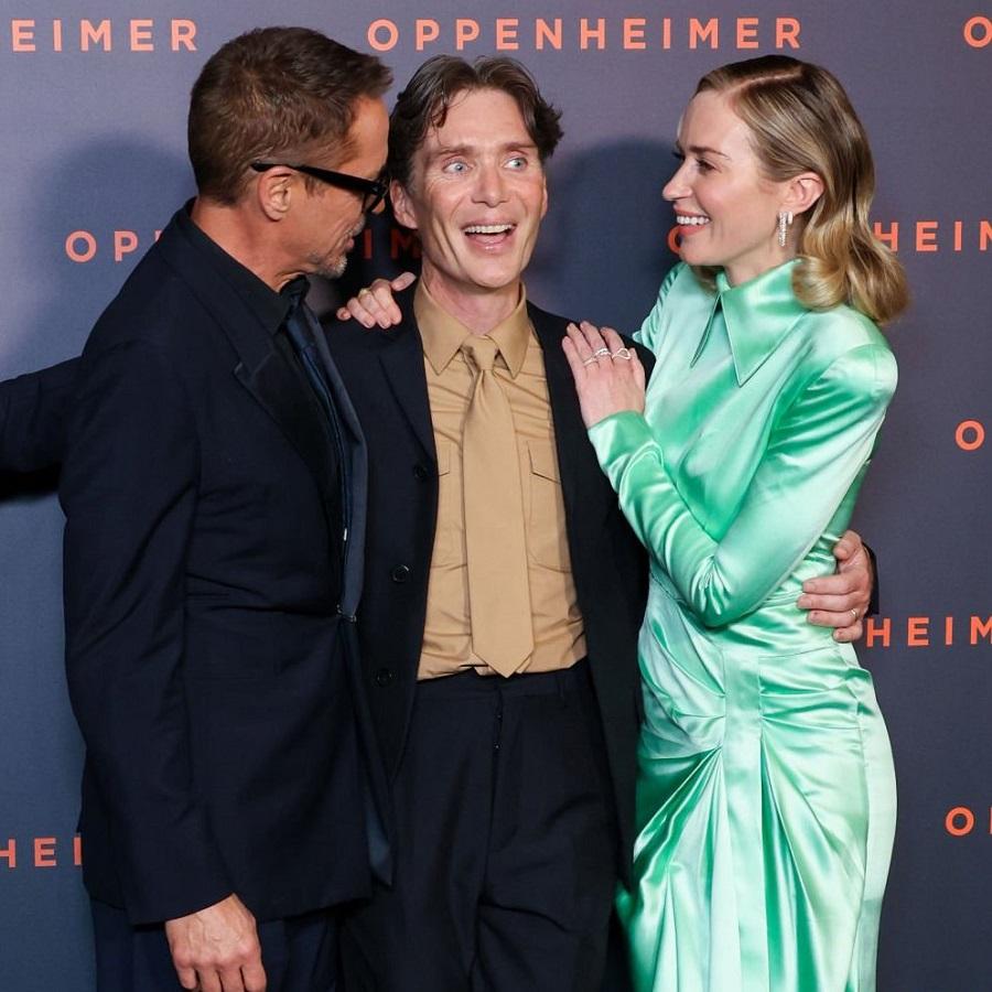 首映禮上,羅拔唐尼與Emily Blunt夾實Cillian Murphy引佢笑。