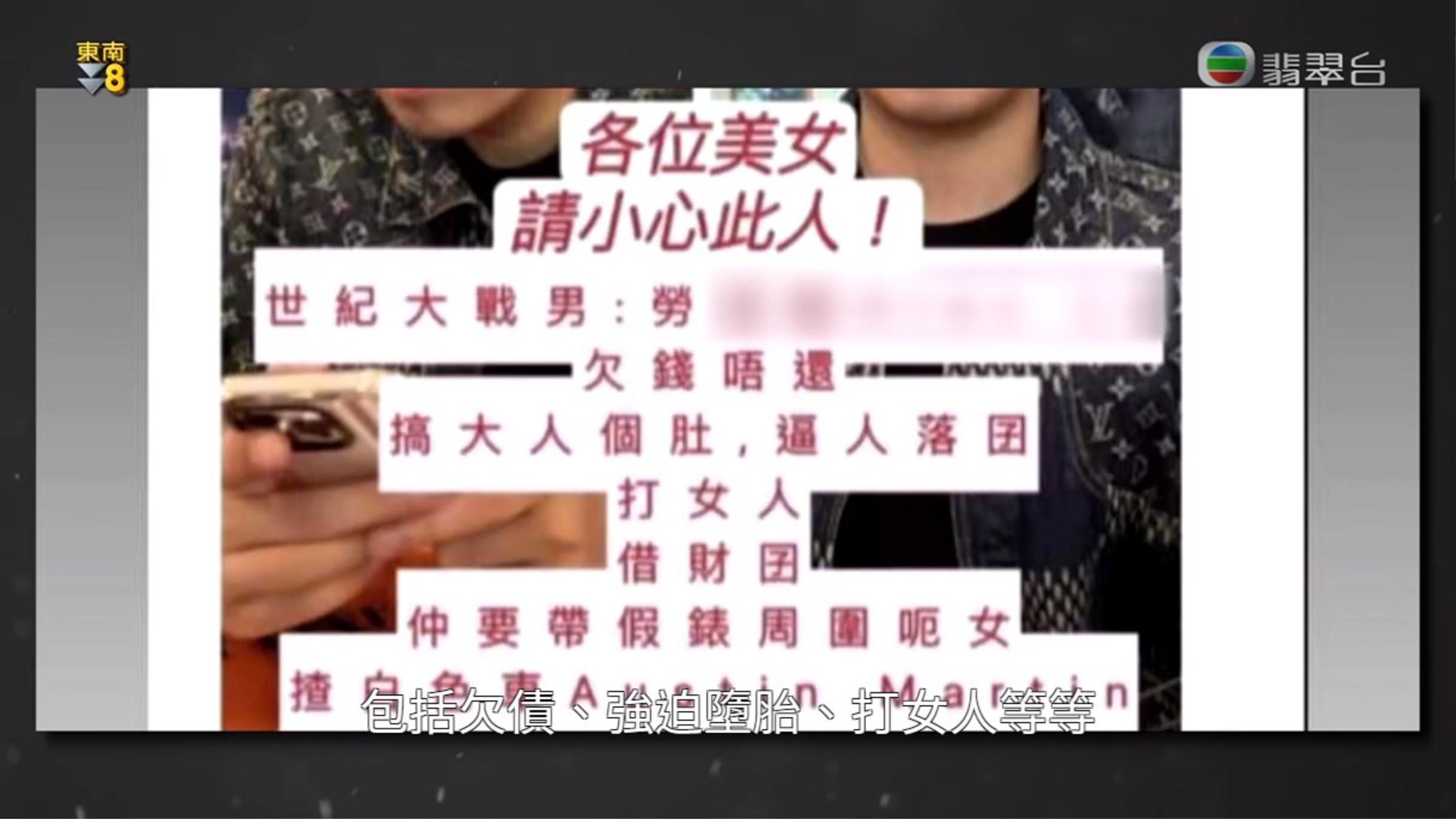《東張西望》指Aqua前男友姓勞,網上有不少消息稱勞姓男子曾欠債、強迫墮胎、打女人等。不過男方在中學的運動成績不錯,曾是香港武術代表隊成員,於09年東亞運動會全港公開武術錦標賽中奪得42式太極拳、太極劍冠軍及槍術亞軍,也是2009年傑出青少年運動員。