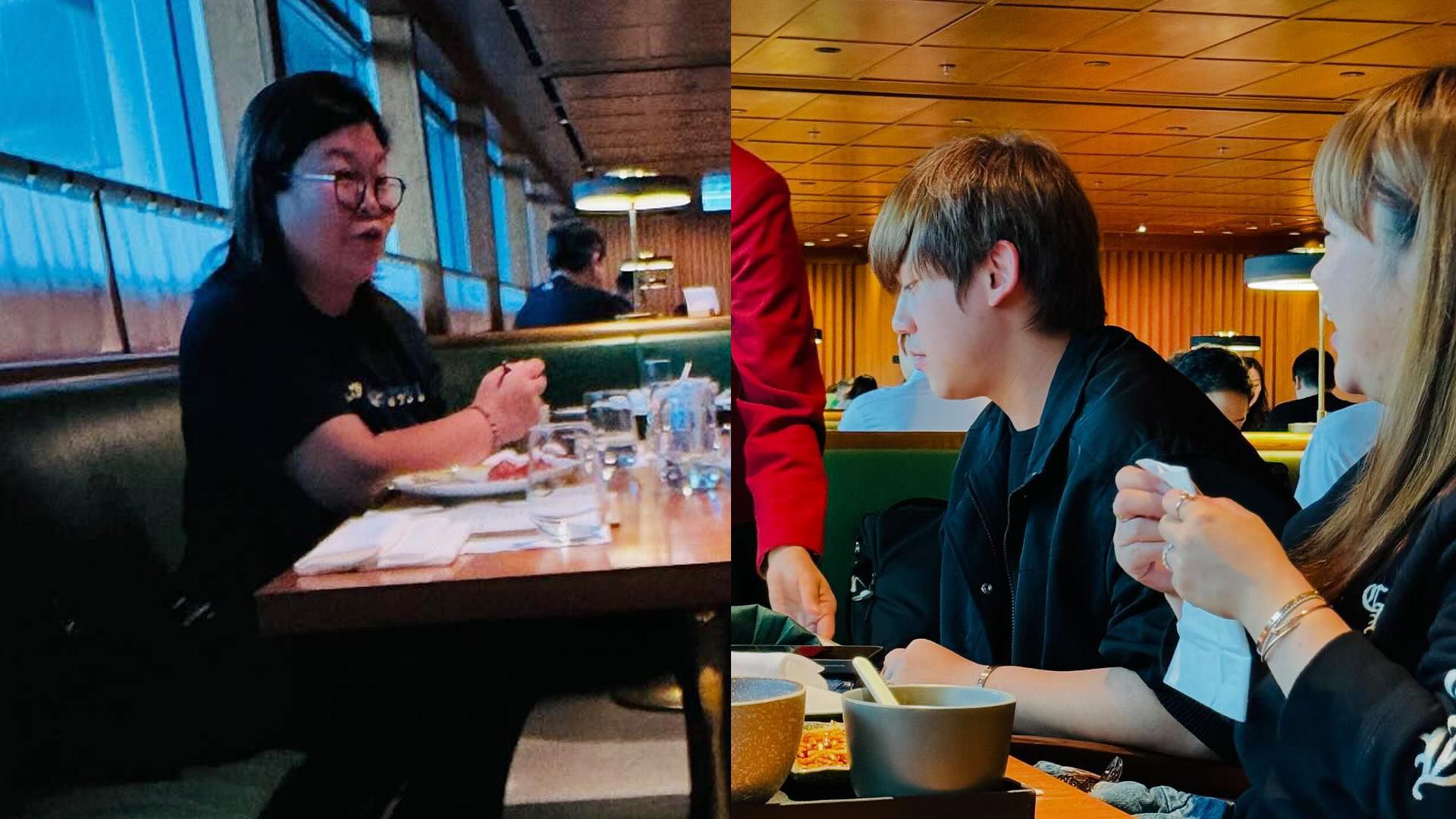 8號風球於昨晚(13日)發出,直至今早10時20分改掛3號信號。由於颱風桃芝只是影響部份航班,因此仍有不少旅客前往機場,亦包括花姐及姜濤。今早有網民在機場的貴賓室巧姜濤、花姐及工作人員,三人在國泰航空香港商務貴賓室享用早餐。從網民分享的照片所見,姜濤仍是睡眼惺忪,眼皮浮腫。該網民留言說︰「八號風球Pier吃早餐準備起飛,竟然撞到姜濤同花姐。」