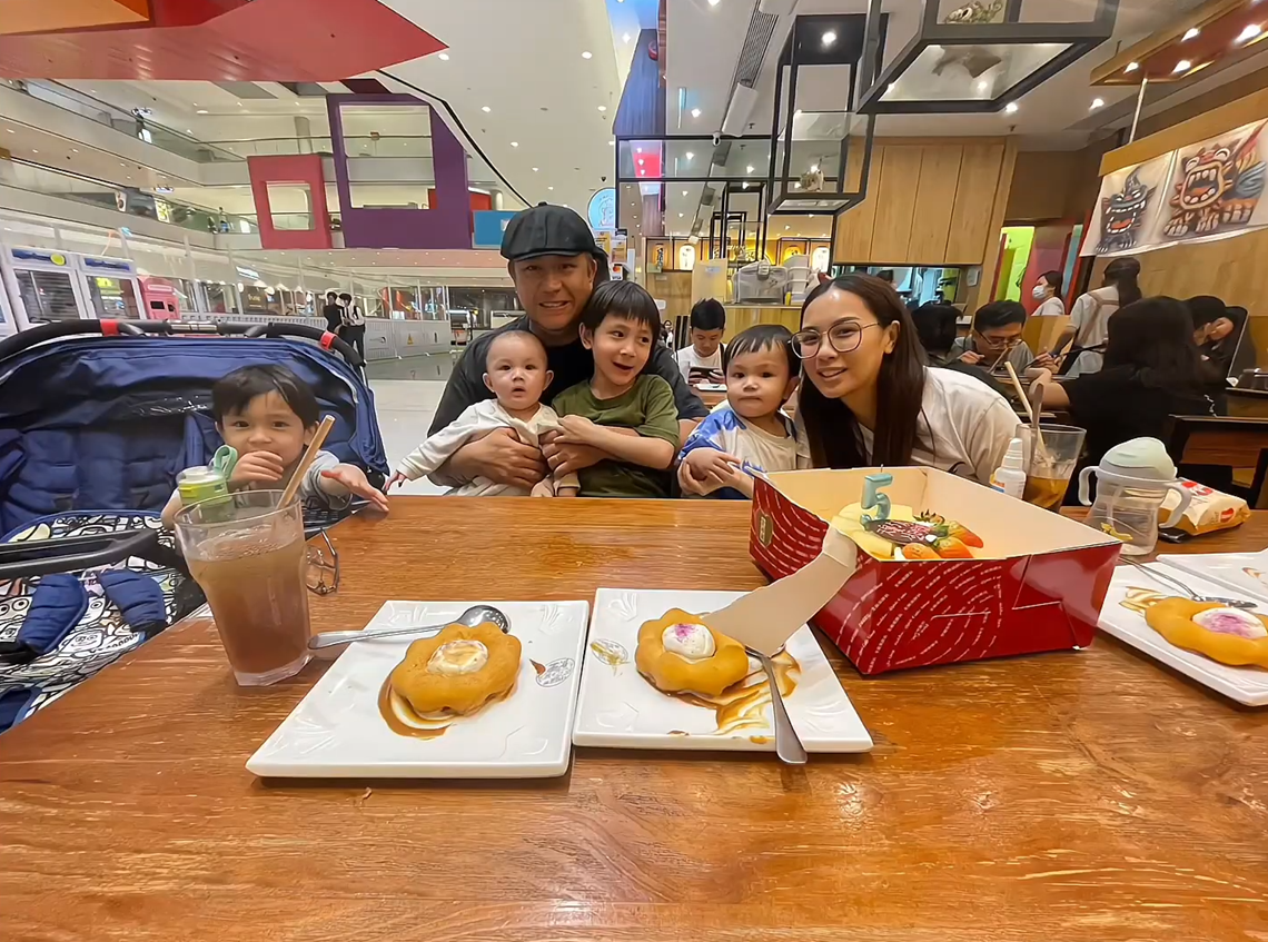 張致恒(Steven)與太太區燕雯的大仔張天寶5歲生日,StevenIG分享跟囝囝慶祝的照片,見到他們一家六口外出食飯慶祝。