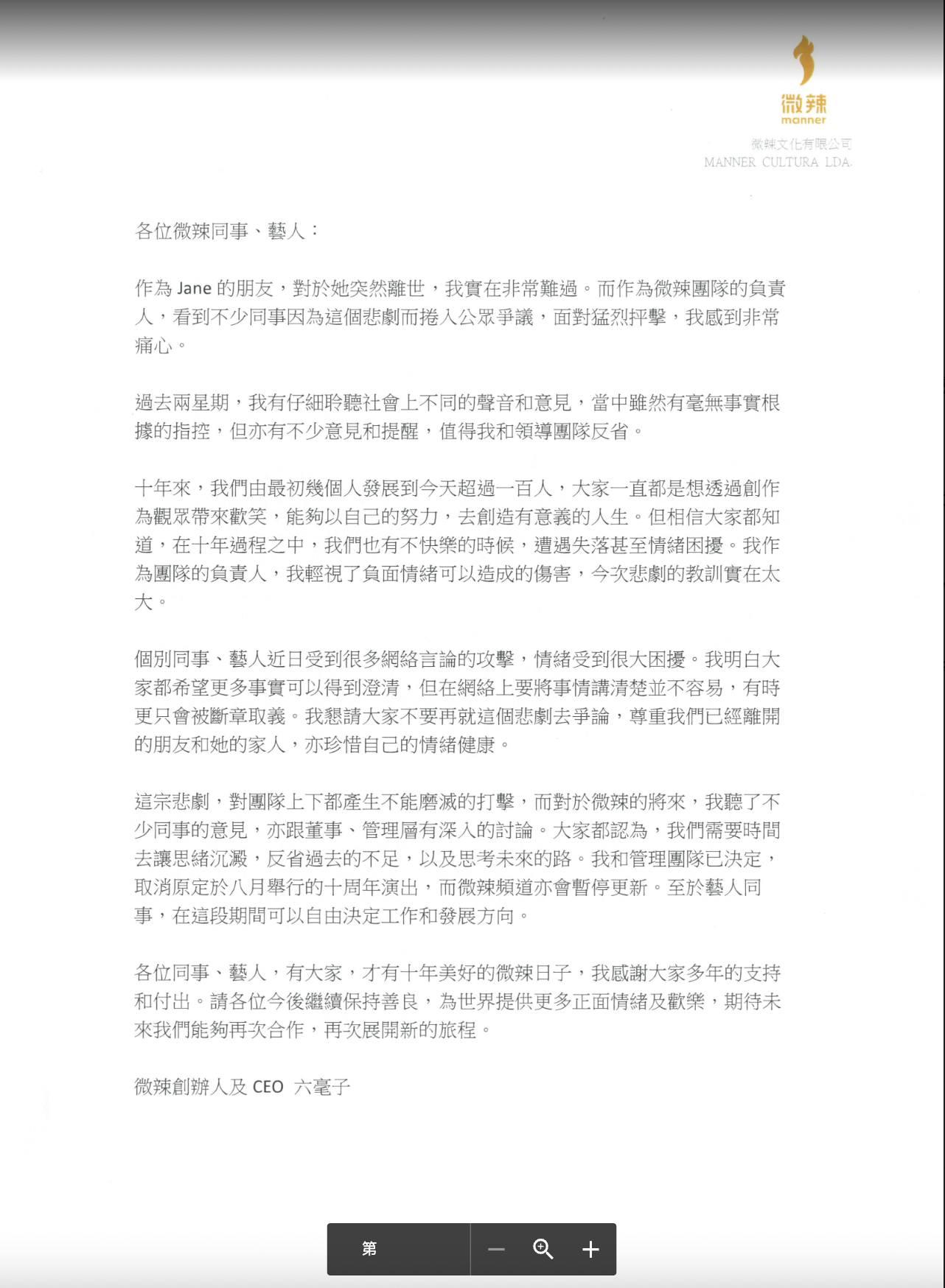 六毫子在信中稱「作為Jane的朋友,對於她突然離世,我實在非常難過。作為微辣團隊的負責人,看到不少同事因為這個悲劇而捲入公眾爭議,面對猛烈抨擊,我感到非常痛心。」他聲稱在過去兩星期有仔細聆聽社會上不同的聲音和意見,並指當中有毫無事實根據的指控,亦有不少意見和提醒,值得他和領導團隊反省。