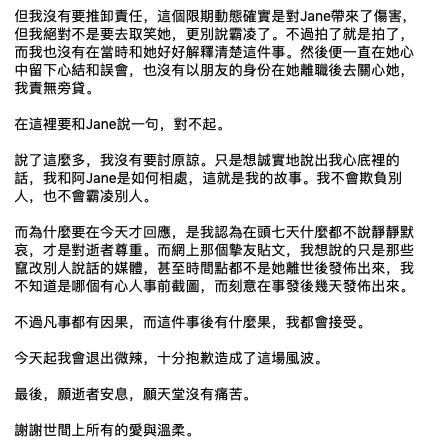 卡特認為阿晶逝世後,喊喊相事件開始被炒作成霸凌行為,令佢感到無奈。卡特承認喊喊相對阿晶帶來傷害,「我也沒有在當時和她好好解釋清楚這件事。然後便一直在她心中留下心結和誤會,也沒有以朋友的身份在她離職後去關心她,我責無旁貸」。隨後卡特向阿晶道歉。而卡特亦喺文末宣布退出微辣。