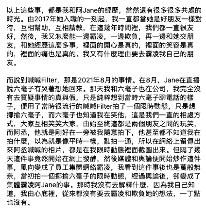 至於喊喊相事件,卡特解釋得知阿晶提及六毫子喊住留佢,當日卡特同六毫子都喺公司,「我完全沒有去質疑事情的真與假,只是純粹想到當時六毫子聊電話的樣子,便用了當時很流行的喊喊Filter拍了一個限時動態,只是想揶揄六毫子,而六毫子也知道我在笑他」。
