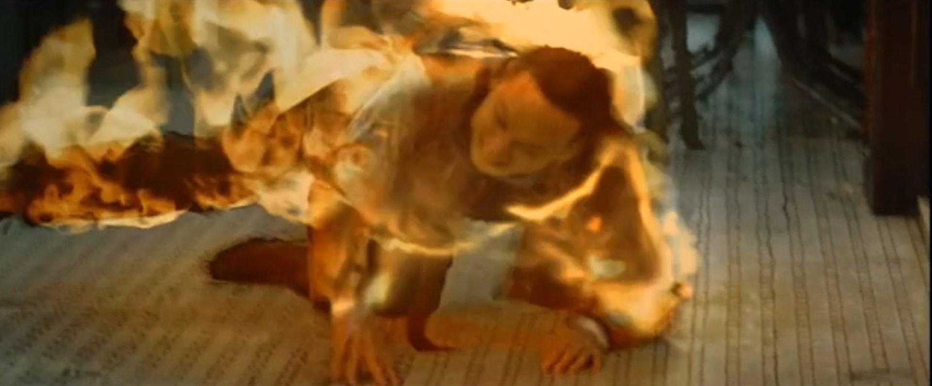 塗上那層防火液的心情真是難以用筆墨形容,「演員請就位」那一刻⋯⋯劉偉強還向著我細心的娓娓道來說當點著火之後,攝影機器開動,我的動作是先撞向面前的桌子,再撲向左邊的魚缸,然後在地上翻滾!