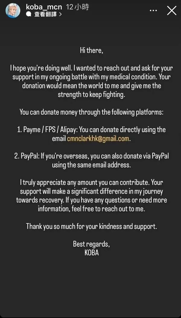 Koba亦有截圖,並喺IG Story出PO反駁:「依家係等緊死啊...擴散咗又半癱瘓,咁你想我點樣?去返工?去拍嘢?(你估我唔想?)招募大家捐款我都寫得好清楚,用喺我生活同醫療上,亦都希望大家隨心。想捐就捐,唔會強求、強逼,咁你捐完又唔想捐咁係點樣?我淨係可以講句多謝你...」