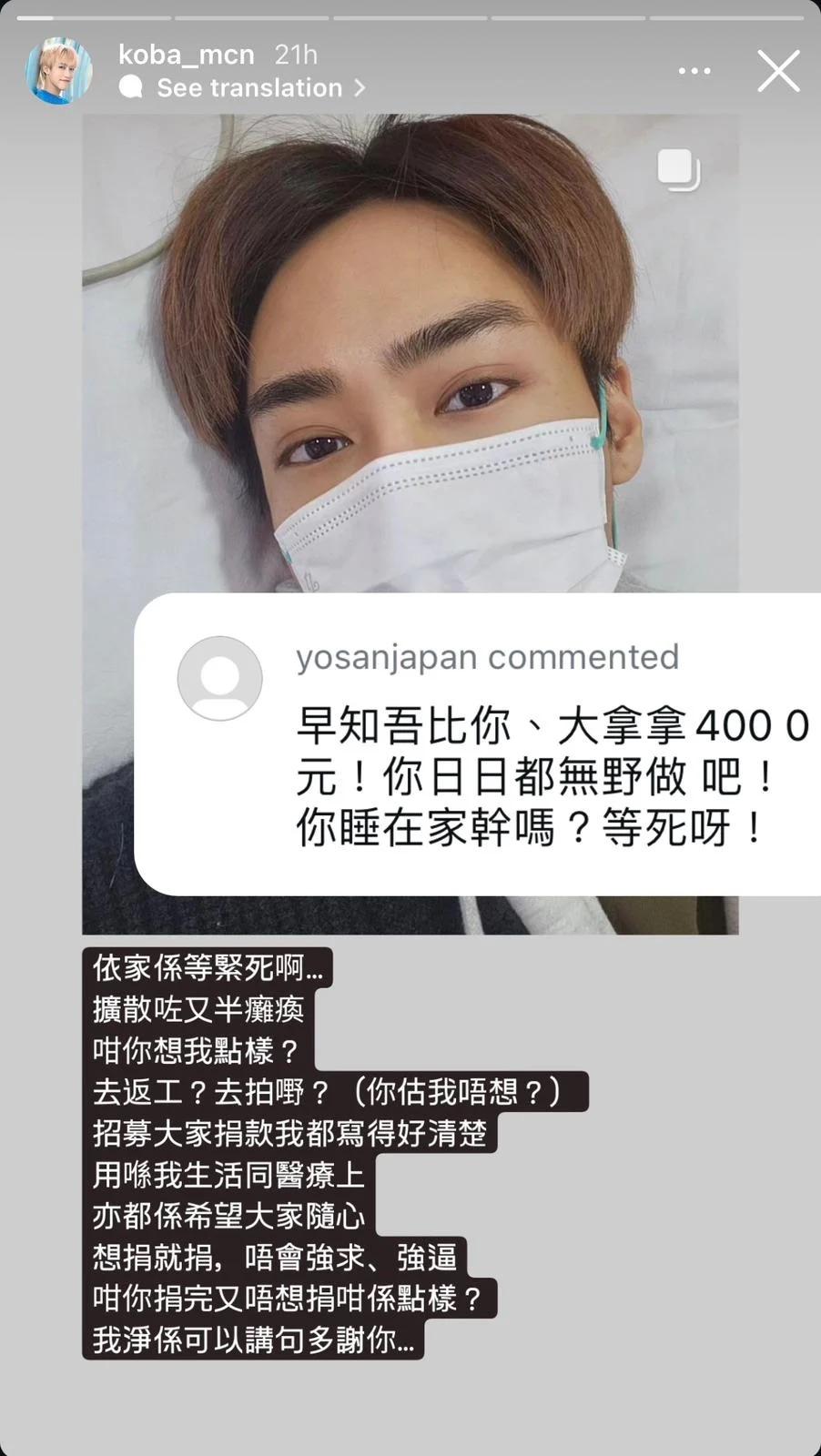 近日佢因腫瘤擴散導致劇痛,下半身更加失去知覺。Koba喺留院期間喺IG大玩「你問我答」,點知被其中一名捐款者辱罵:「早知吾比(唔畀)你、大拿拿4,000元,你日日都無野(嘢)做吧,你睡在家幹嗎?等死呀!」