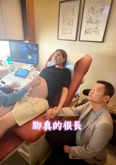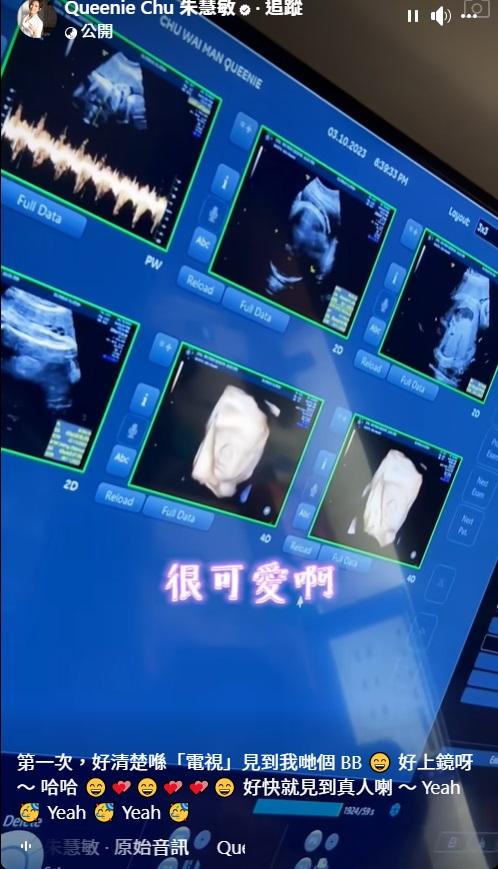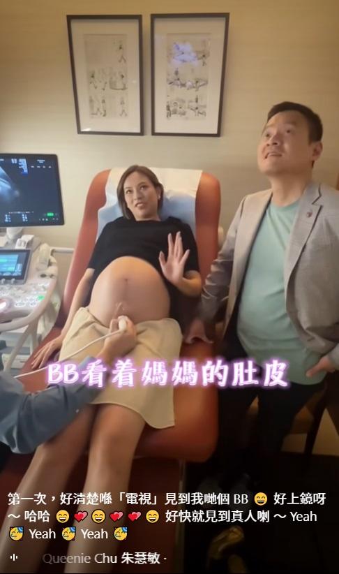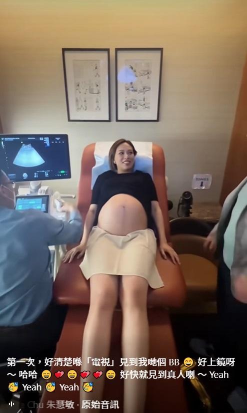 朱慧敏上載的片段見到她在老公陪同下做產檢,二人全程手拖手,而她的最新體重是71公斤,比起上次產檢重了4公斤。另一條影片見到醫生為她掃超聲波的情況,醫生一邊講解畫面的影像︰「BB個頭,BB看住媽媽肚皮,面向上頭指向下,胎水份量足夠,胎盤正常,塊面望住媽咪肚皮,腳仔真的好長,我哋見到頭身腳都在正常範圍,係隻腳長啲,計出嚟BB(體重)有2.4公斤、5.6磅,在正常水平上亦正常地向上增加。(BB樣)都好清楚。我估計接近足月時,接近3公斤多啲。」