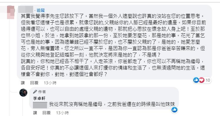 李卓軒12日在Facebook發文,預告14日要去電視台錄影,解說搶救父親收藏甘苦談,此外他也多次在Facebook上砲轟林靖恩,有網友留言勸他放下,但他回應:「我從來就沒有稱她是繼母,之前我爸還在的時候是叫他妹妹。」