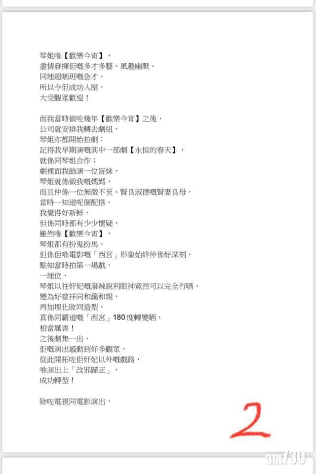 於1971年加入TVB的汪阿姐坦言,起初對琴姐印象停留於與琴姐相識相知多年的汪明荃任,儀式舉之後,汪阿姐把完整黑白粵語片的「西宮」模樣,直至在《歡樂今宵》真實相處,驚覺琴姐多才多藝又風趣幽默。及後,首次合作拍劇集《永恆的春天》,見證琴姐「改邪歸正」由奸妃變賢母。而她最感激是琴姐在她往粵劇界發展,對她的提攜與支持。最後,她憶述5年前探望琴姐時,齊齊唱粵曲的歡樂時光,她表示,「其實我真係唔太肯定佢仲記唔記得我, 但係我,一定唔會忘記,喺我嘅演藝路上,曾經同一位咁值得我學習同尊重嘅前輩共事過,能夠同你認識同合作,係我嘅榮幸。琴姐,一路好走,晚輩永遠懷念。」
