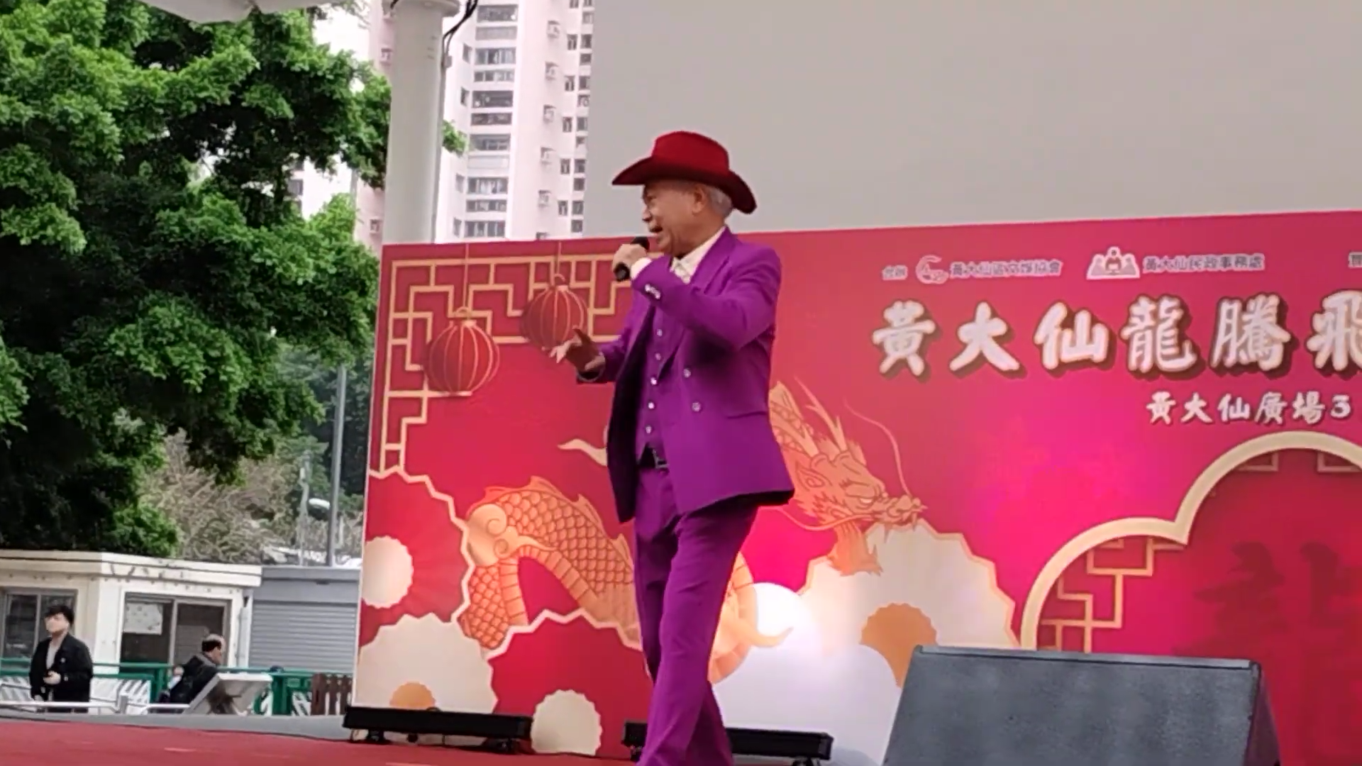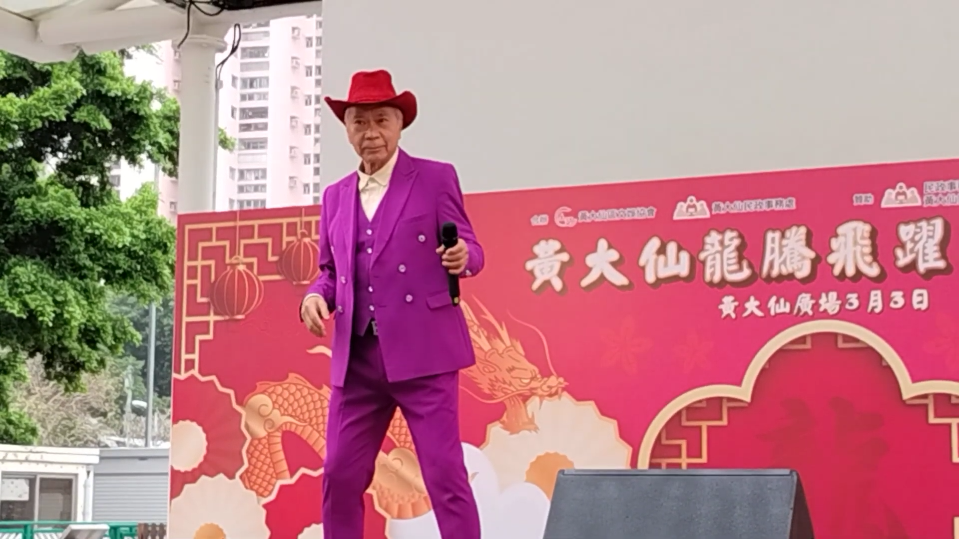 酒樓騷會否再加場就未知,但基哥今日探完Chris後,換上歌衫便到黃大仙出席嘉年華活動,以壓軸嘉賓身份出場。以一身紫色西裝打扮的他戴上紅色牛仔帽,上台向在場觀眾打招呼,更刻意壓低聲線問︰「大家好嗎?生活愉快嗎?發育正常嗎!乜都假,最重要身體健康!」他再跟觀眾閒談幾句,全場氣氛非常高漲,接住他唱出《男子漢》。