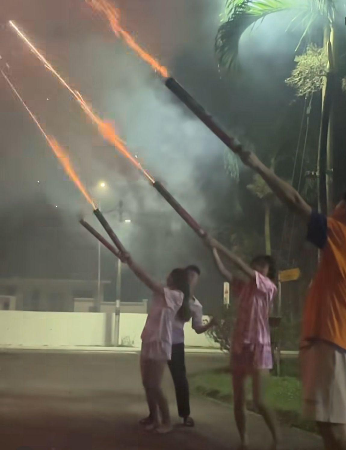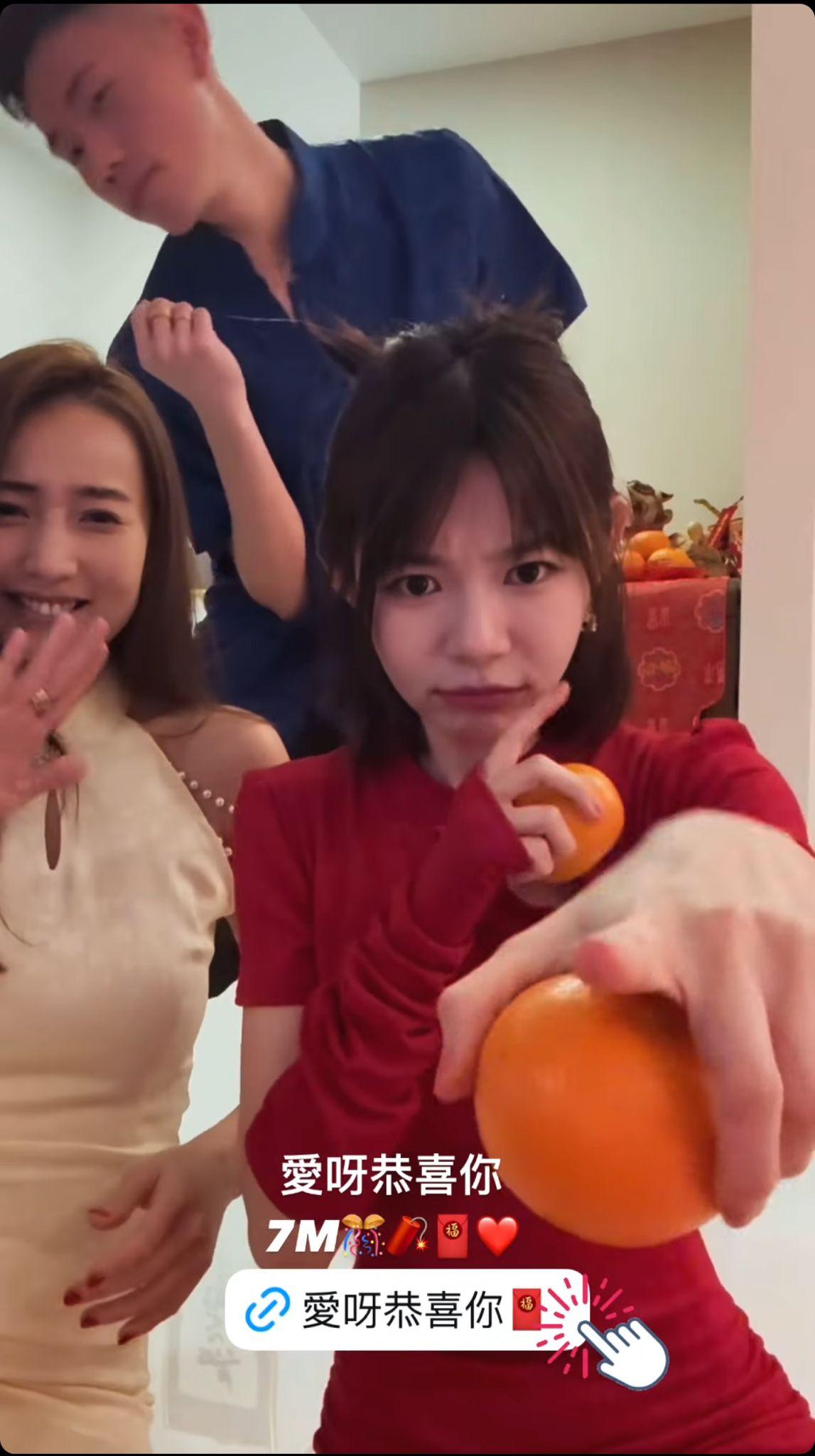 至於盛傳與Edan蜜運中的林明禎,新年期間返家鄉馬來西亞跟家人慶祝,日前一家齊放煙花,各人拎住一支巨大龍吐珠玩得相當興奮,明禎更跳跳紮盡顯少女一面。之後,明禎繼續更新社交網,分享穿上一件頭鮮紅短裙的照片及影片,見她與屋企人開心拜年,既逗利是又托住兩個柑配合有份參與的賀年歌《愛呀恭喜你》,跟家組、細佬玩得十分盡興。