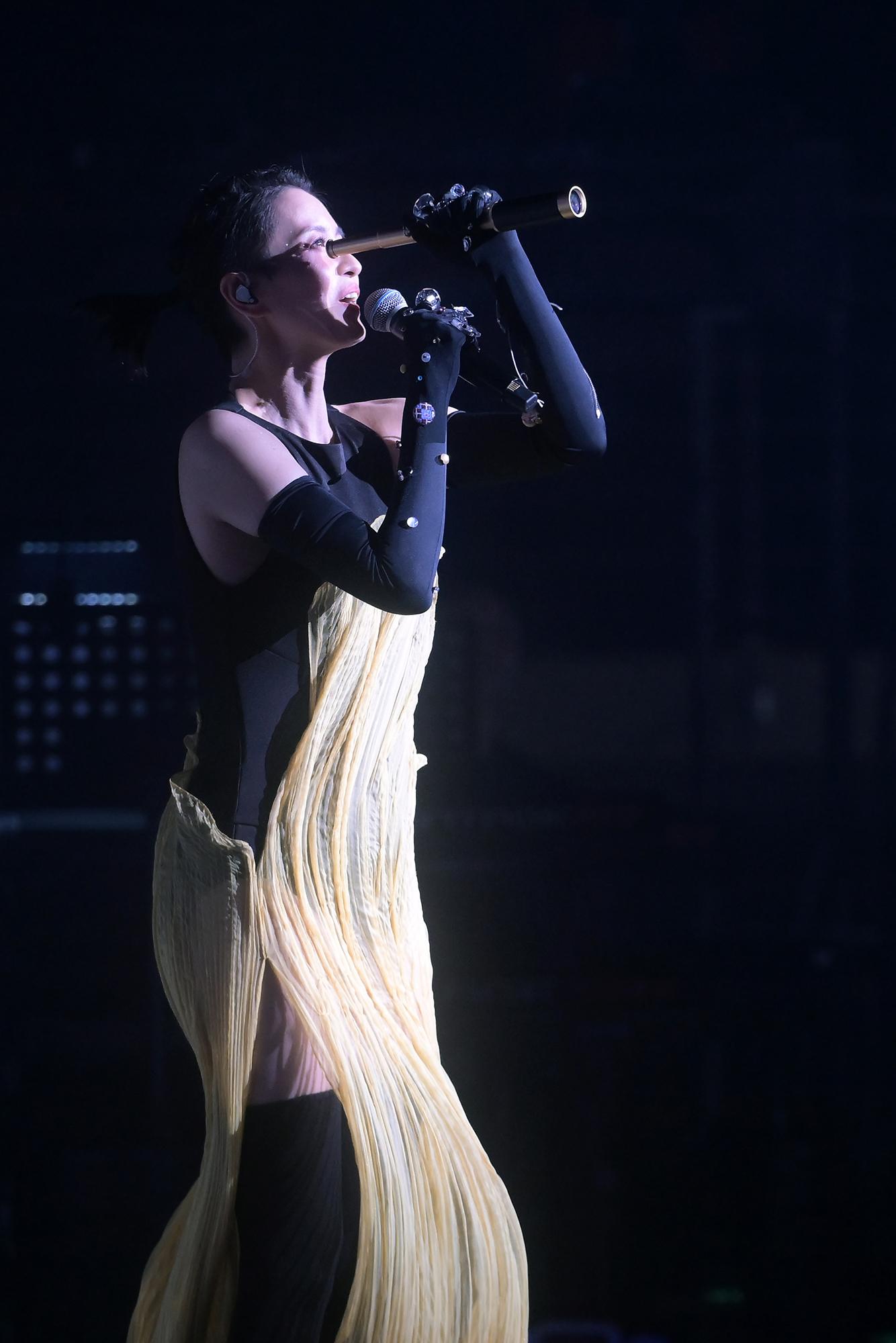 後來到脱外套的部分,Gigi 一直被外套卡住手袖,結果連咪都丟到地上,其時已經來不及了唱歌,Gigi 當機立斷叫停音樂,從新來過,更在台上笑言「我這大外套必須甩好!必須重來」引得全場尖叫聲不斷!