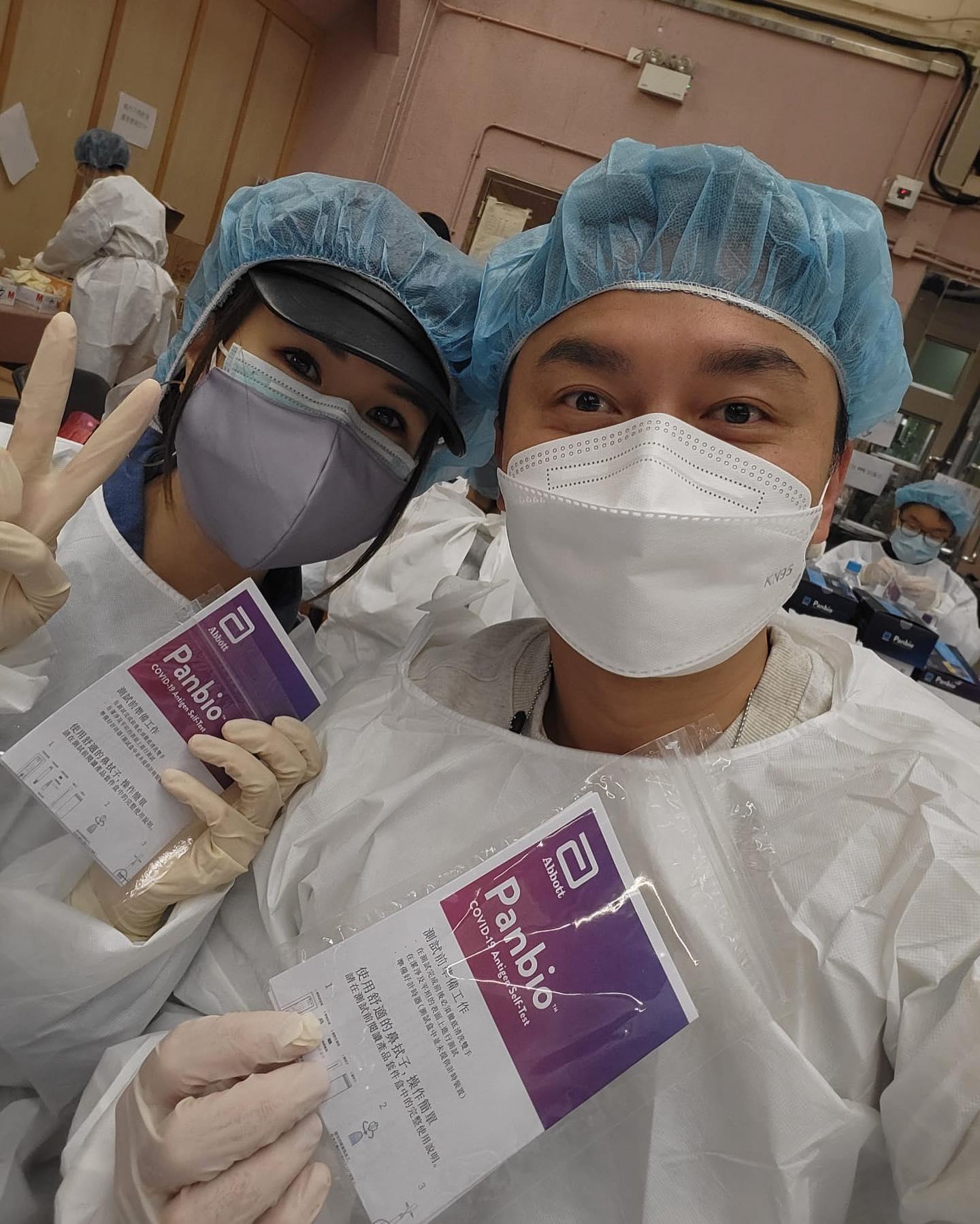 玻璃朱留言說︰「剛忙完幫大家採購特價檢測棒,今日又又幫深水埗民政事務署去為政府包裝檢測給香港市民!每個義工入場前都要即場做快速檢測,做足安全衞生措施。感謝高Sir安排!今日遇到很多熱心的義工市民,大家都為社會出分力而開心!#感謝祖國 #香港加油 #齊心抗疫 #玻璃朱 #朱庭萱」