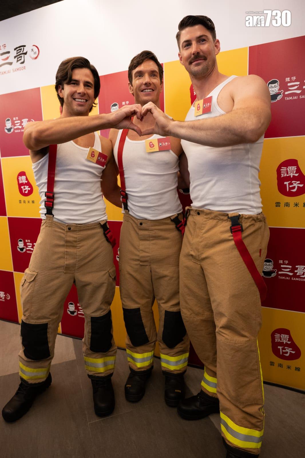 三位消防男神今日以白色背心出席活動,大展麒麟臂,又應在場人士要擺出心心甫士,他們更餵蝦頭及娟姐食譚仔。他們在活動上表示昨日已經品嚐米線,很愛飲檸檬茶,明天將會到其他地方了解香港的文化。