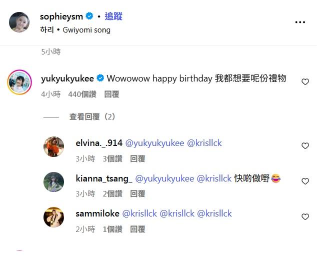 Sophie將自己變成最特別的生日禮物,這一浪漫舉動引起網友熱烈討論,大家紛紛對他們的甜蜜互動表示驚嘆。許多網友留言表示:「救命呀!我對眼都快被你們閃到盲了!好sweet呀!」還有網友稱讚Sophie的創意,認為這份禮物既驚喜又感動。而圈中好友羅毓儀,也忍不住留言:「Wowowow happy birthday 我都想要呢份禮物。」更加引發網友熱烈回應,並標示她的男友林俊其要「 快啲做嘢」。