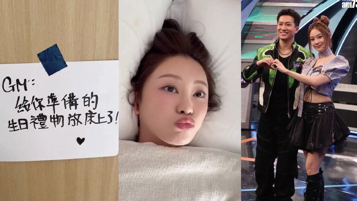 今日是曾展望(GM)的28歲生日,也是他與葉蒨文(Sophie)相戀後的第一個生日,Sophie在IG上分享一段驚喜影片,片段先影著一道門,門上貼了一張紙條,上面寫著:「GM:給你準備的生日禮物放在床上了!」當GM打開酒店房門時,映入眼簾的是一張king size大床,上面放滿藍色和白色的氣球,兩個枕頭中間擺放著一個禮物盒,並寫著:「你最喜歡的!」但GM打開盒子後,Sophie可愛地躺在床上,嘟起小嘴,似乎在等待GM的吻。