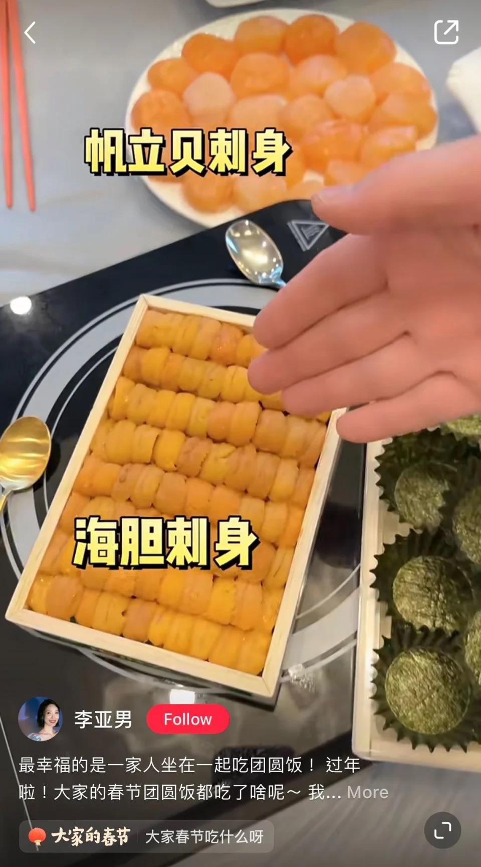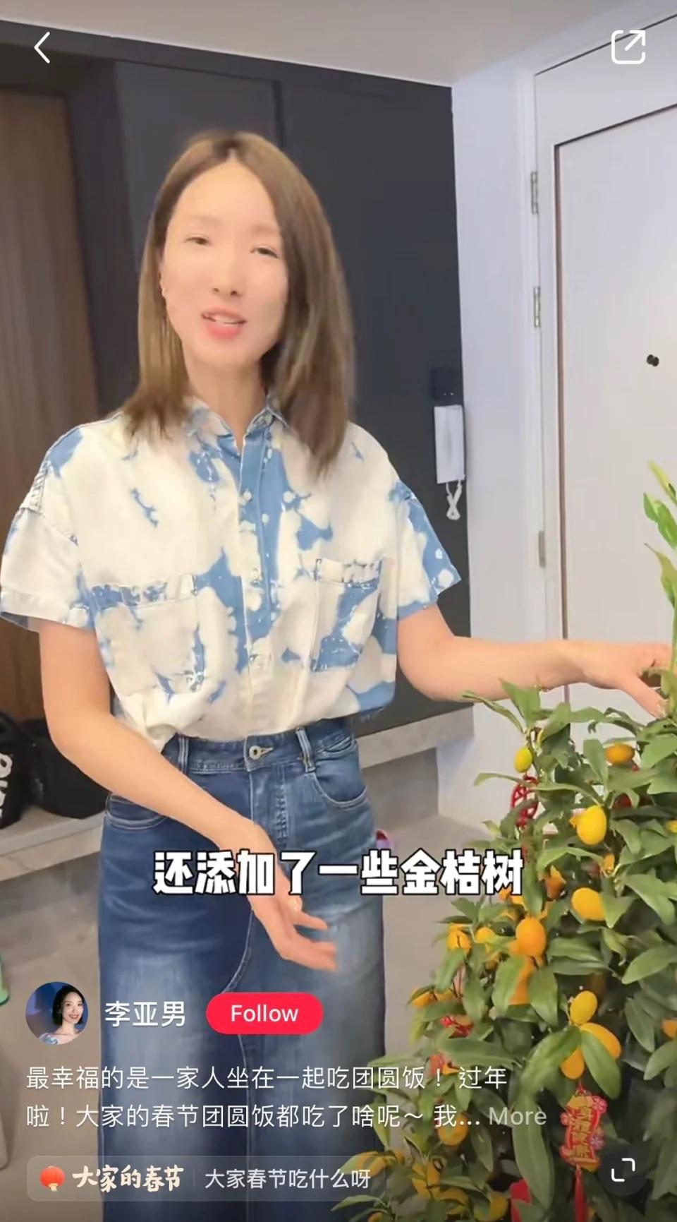 李亞男喺小紅書上載影片並留言:「最幸福的是一家人坐在一起吃團圓飯!過年啦!大家的春節團圓飯都吃了啥呢~我們家晚上要開party,為了滿足所有人的口味,這次的團圓飯東南西北各種口味都安排上了~新的一年要繼續多陪伴家人,珍惜和家人團圓的時光!#很男不有趣的日常 #浪漫生活的記錄者 #大家的春節 #我家年味不一般 #明星不止AB面」。
