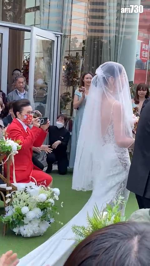 穿到紅噹噹的汪明荃及江美儀獲安排坐在頭排位置,阿姐在證婚儀式開始前與主人家的親友合照。當新娘子Vanilla在父親陪同下步入婚禮註冊場地,坐在觀眾席的阿姐已舉機拍下照片,更一度興奮得走到攝影師身旁,為王鎮泉記錄重要時刻。