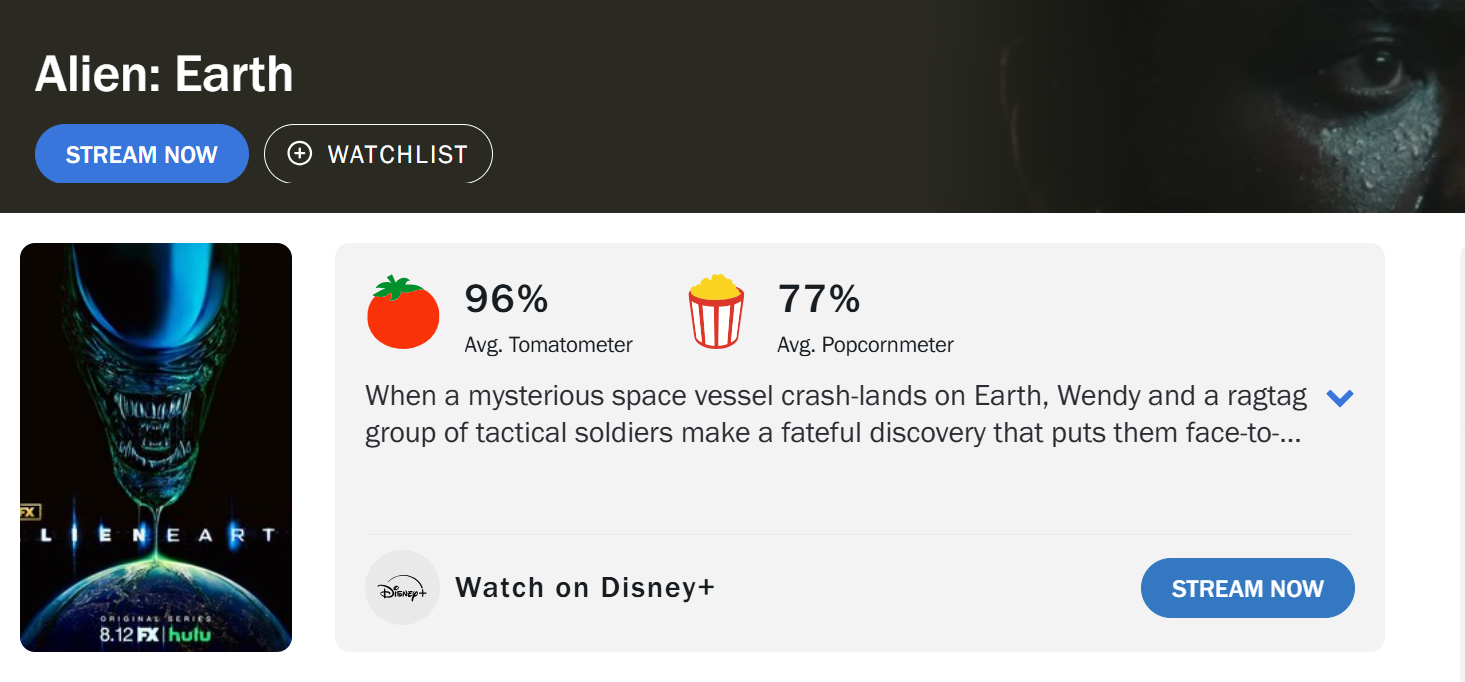 《異形:地球》上架後,在爛番茄好評高達96% 。
