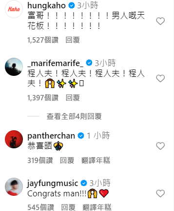 不少藝人湧進他的IG留言祝賀,包括洪家豪、陳蕾、MIRROR的呂爵安(Edan)、雲浩影、馮允謙、COLLAR的Marf、Gao、岑珈其、游學修、Win Win楊安妮等等。Marf更留言把他的名字改為「程人夫」,而洪嘉豪則留言說︰「富哥!!!!!!!!男人嘅天花板!!!!!!!」