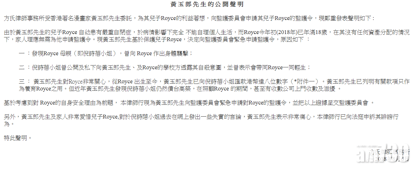 不過自她們母子回港之後,就爆出黃玉郎入稟向前女友爭取兒子撫養權一事,二人更不時隨空開火。昨日黃玉郎透過律師行發出聲明,內容稱「發現倪詩蓓曾向 Royce 作出身體襲擊」,又指對方「曾公開及私下向黃玉郎先生、及Royce的學校方透