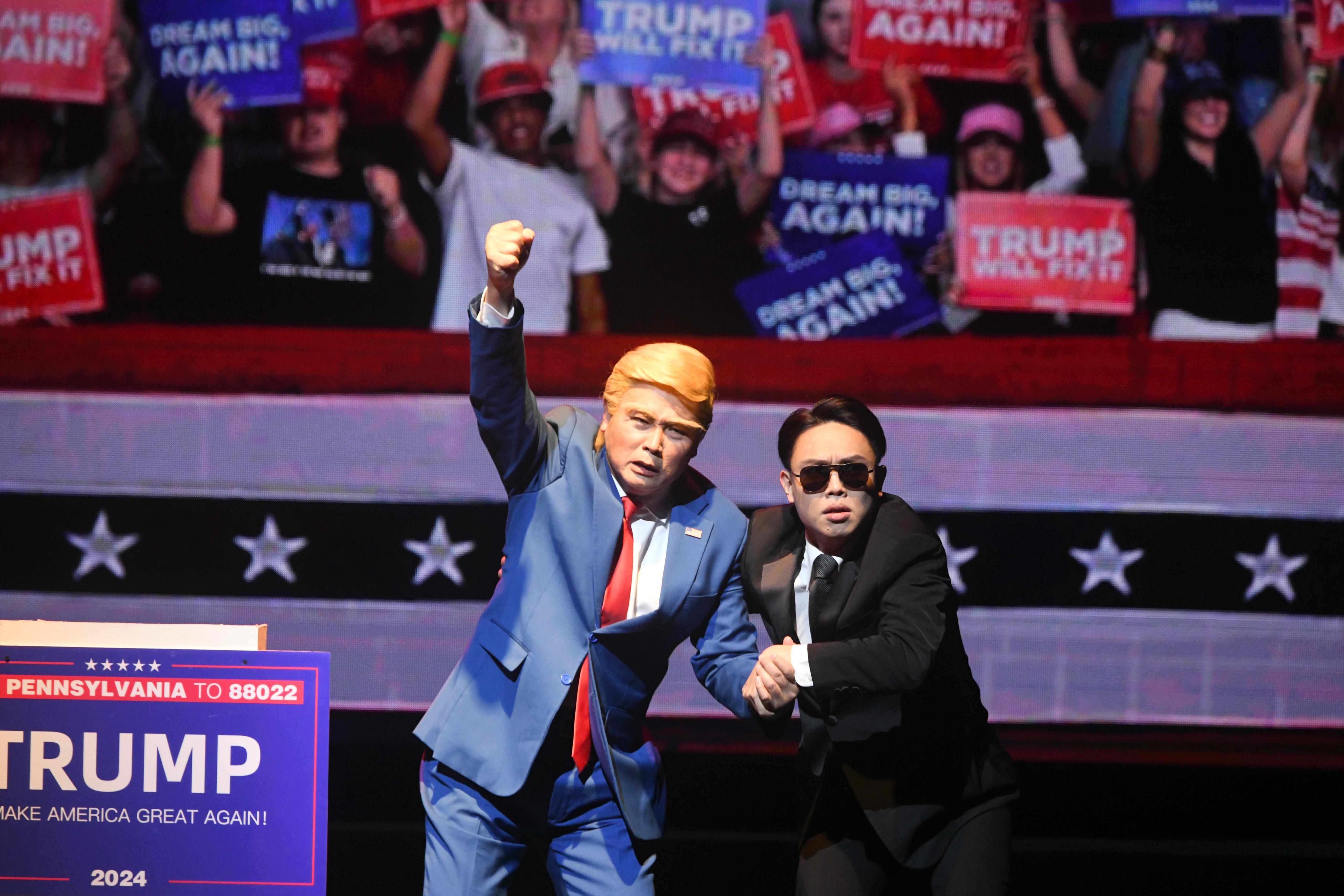 特朗普再由人稱旭哥的大老倌龍貫天演繹,經李居明大膽創造特朗普(又譯作川普)來一個孖生兄弟川普,令旭哥有更大的發揮空間,將兩個因成長背景迥異而截然不同的兩兄弟,交替出場製造矛盾衝突效果,演繹得入型入格,尤其是劇中展出了特朗普兩度遇刺的場面,孖生兄弟引發起真真假假美國總統,非常出位亦笑料爆燈。旭哥特別提到特朗普首度中彈,子彈擦過耳朵,在眾人包圍中堅持高舉拳頭展示英雄一面,旭哥自己設計手執子彈以示無懼刺殺。旭哥笑言李大師的創作看似匪夷所思,但又合情合理,這一幕巧妙的「遇剌」的場景,真的出奇不已卻又風趣幽默,旭哥演來亦大呼過癮,形容是個人演藝生涯一大挑戰。