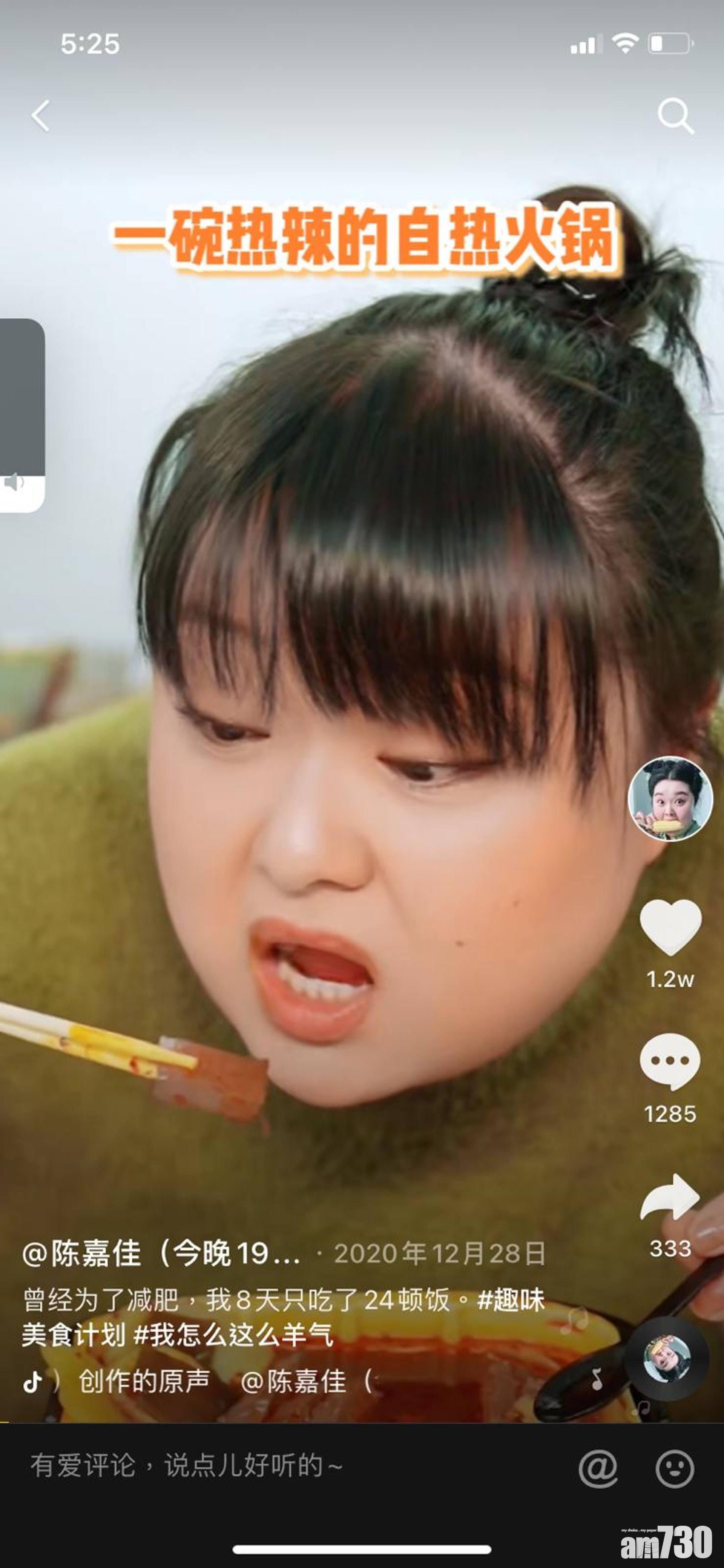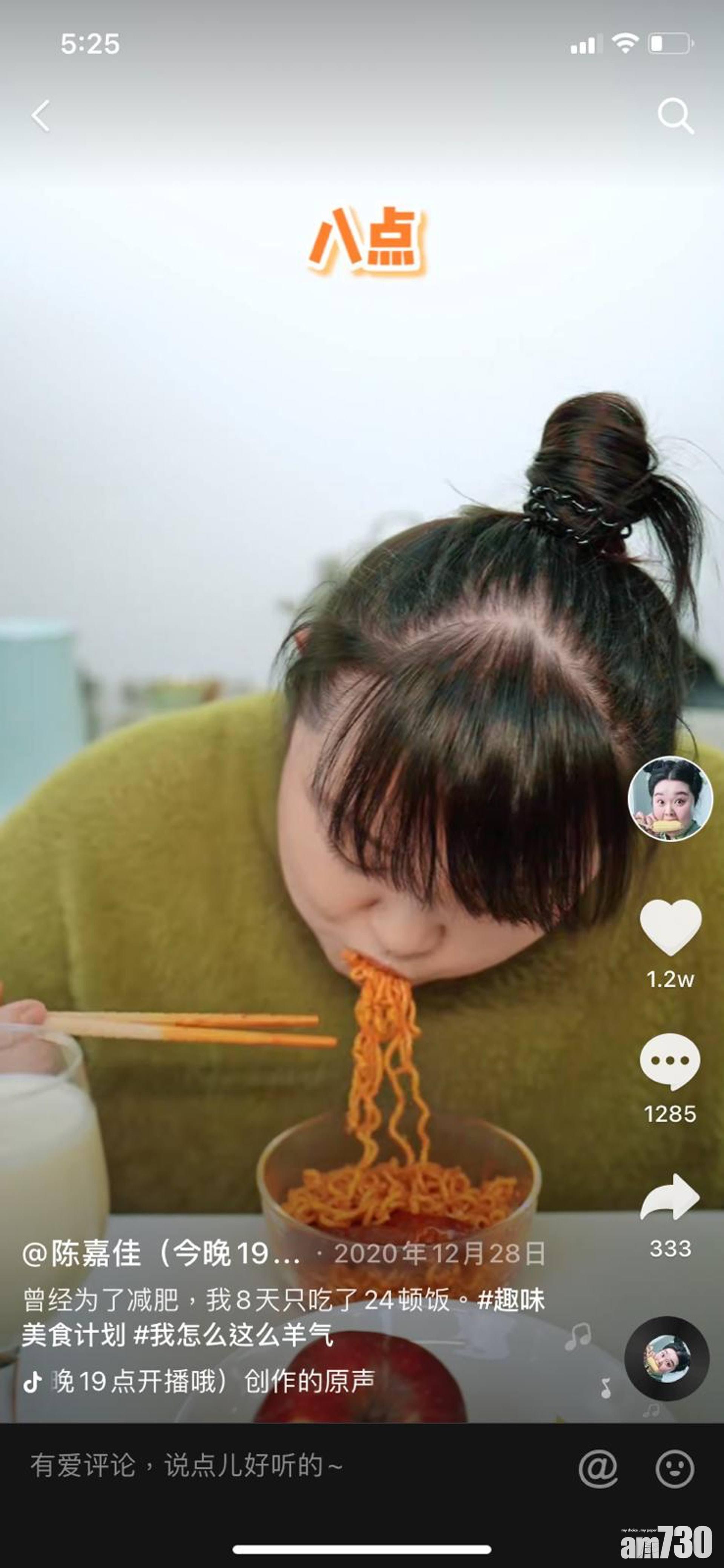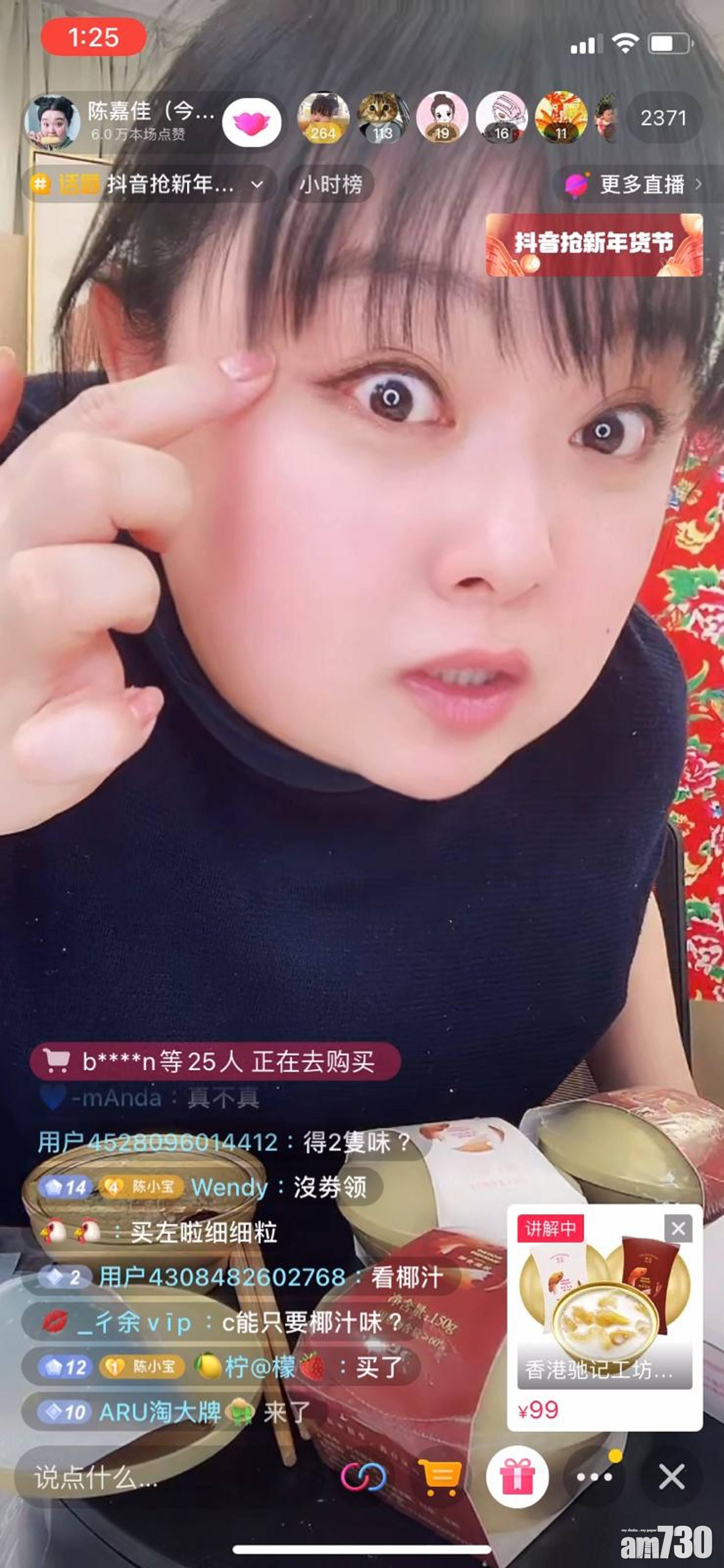 「細細粒」陳嘉佳近年轉攻大陸市場,並開設抖音帳戶成為美食帶貨達人,晚晚開Live和大家介紹美食。她在直播中吃過不停,成功為她的的抖音帳戶吸納42.2萬粉絲。