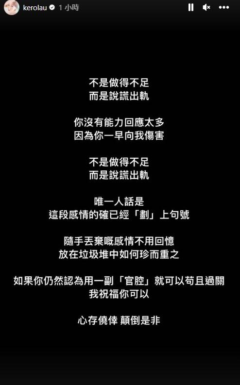 Kero其後在IG反擊對方︰「「不是做得不足,而是說謊出軌,你沒有能力回應太多,因為你一早向我傷害;不是做得不足,而是說謊出軌,唯一人話是這段感情的確是『劃』上句號。隨手丟棄嘅感情不用回憶,放在垃圾堆中如何珍而重之,如果你仍然認為用一副『官腔』就可以苟且過關,我祝福你可以,心存僥倖,顛倒是非。」