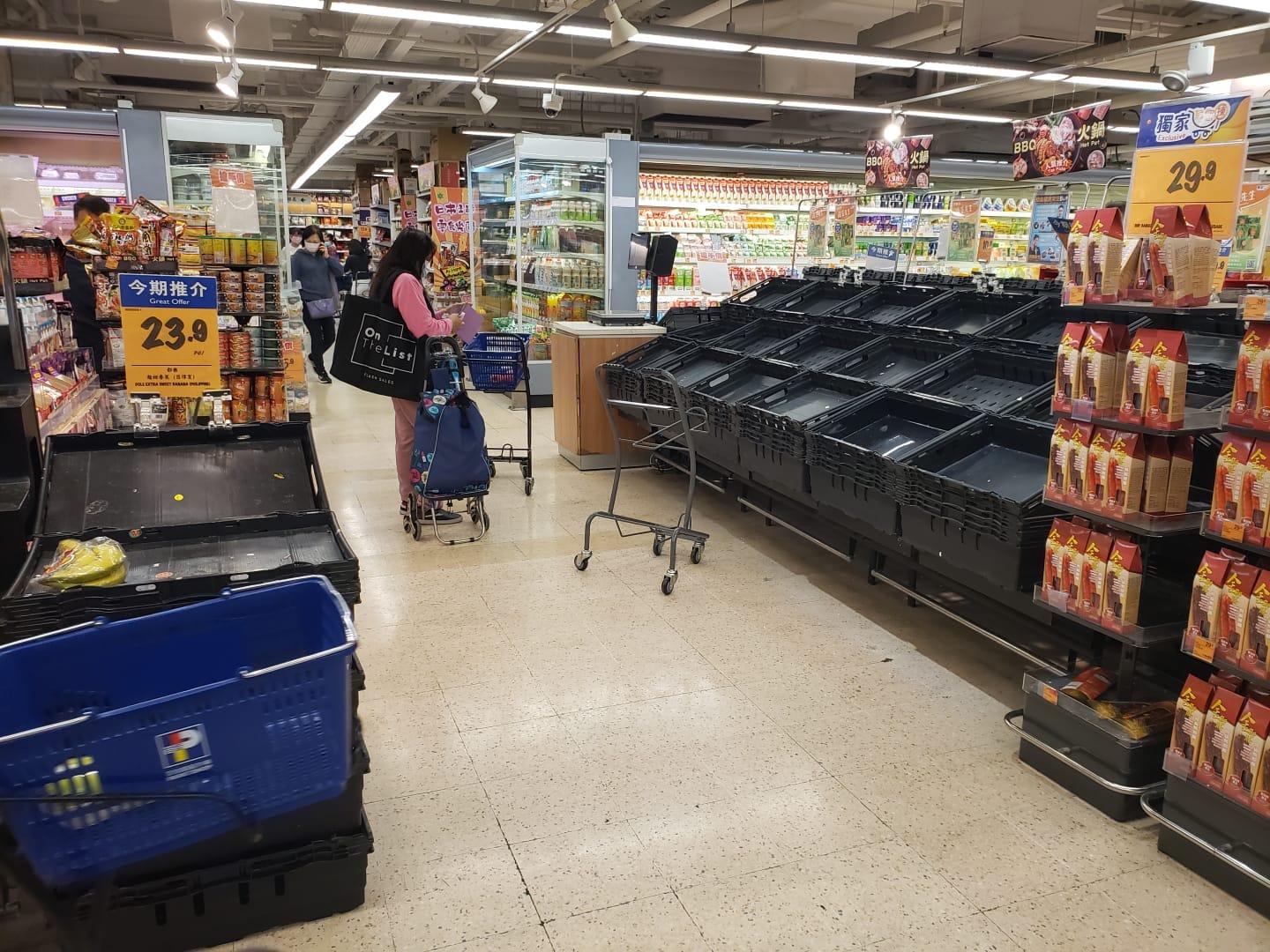 食物及衛生局長陳肇始今早於電台節目透露,當局目前不排除向部分地區實施禁足,強調目的為盡量減少人流,未幾網上瘋傳立法會將會實施7日禁足令,不少市民隨即到超市搶購日用品及食物,多區超市的貨架清零。