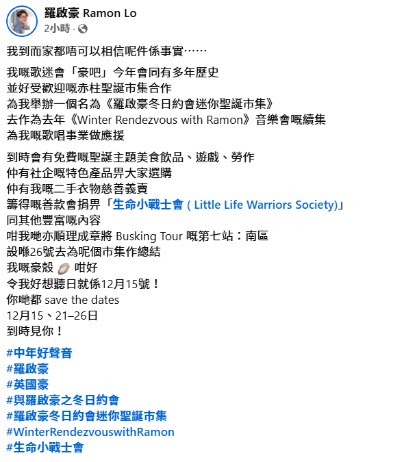 羅啟豪聖誕搞市集不忘做慈善 預告明年出新歌