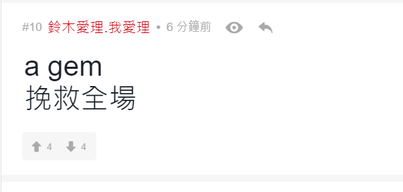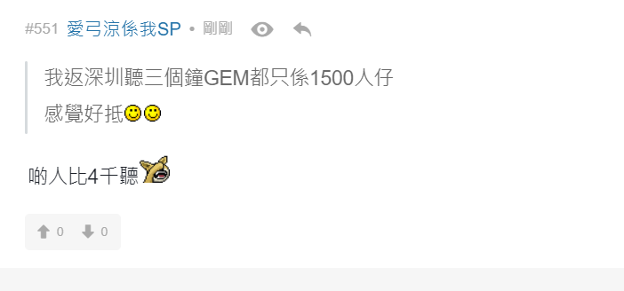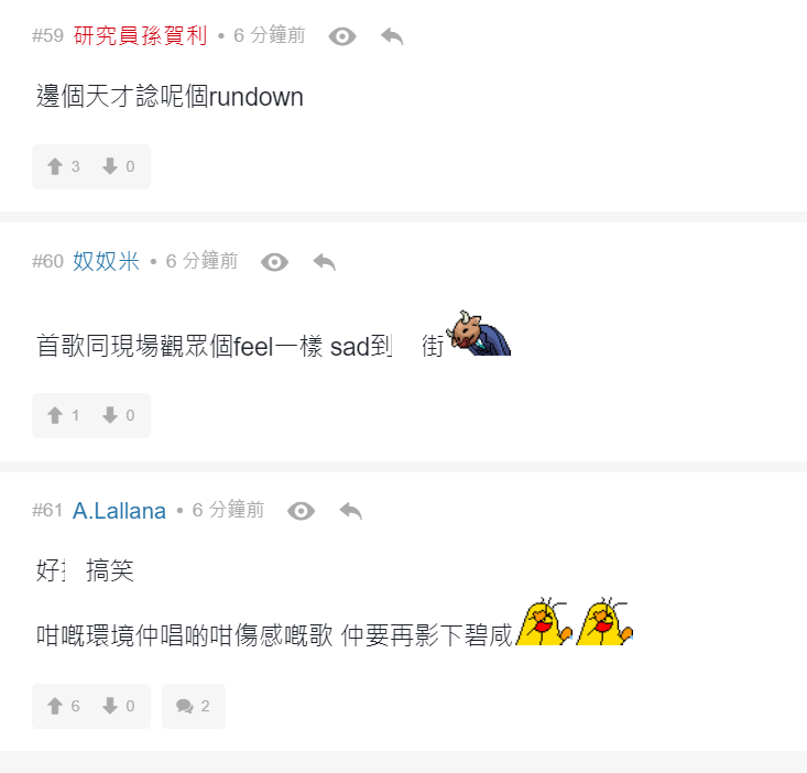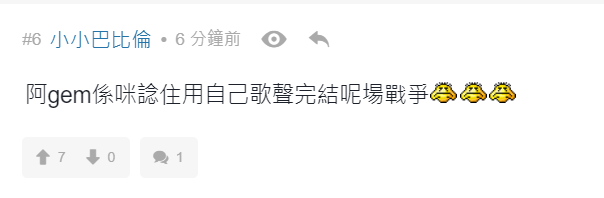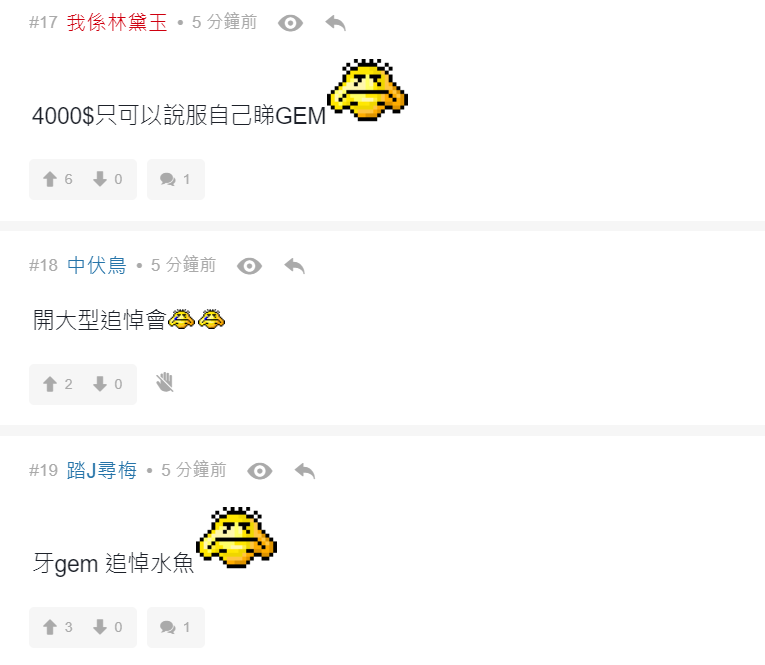 有網民留言說︰「阿gem係咪諗住用自己歌聲完結呢場戰爭」、「4000$只可以說服自己睇GEM」、「牙gem 追悼水魚」、「變咗大型追悼會」、「全日最精彩環節」、「散哂場先黎表演, 仲要唱amazing grace, 邊X個諗出黎」、「悼念全場走晒」、「悼念38000 條水魚」、「無可否認GEM比開場前既表演水準高好多」。