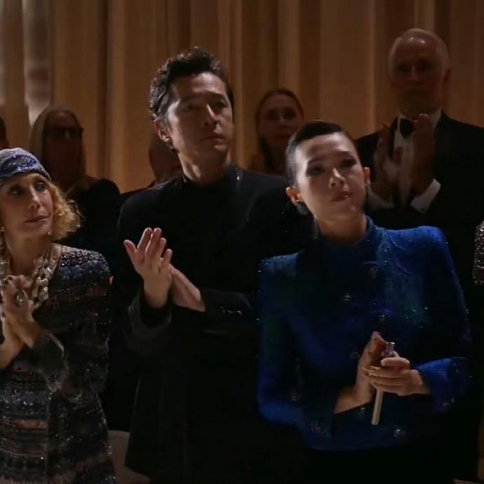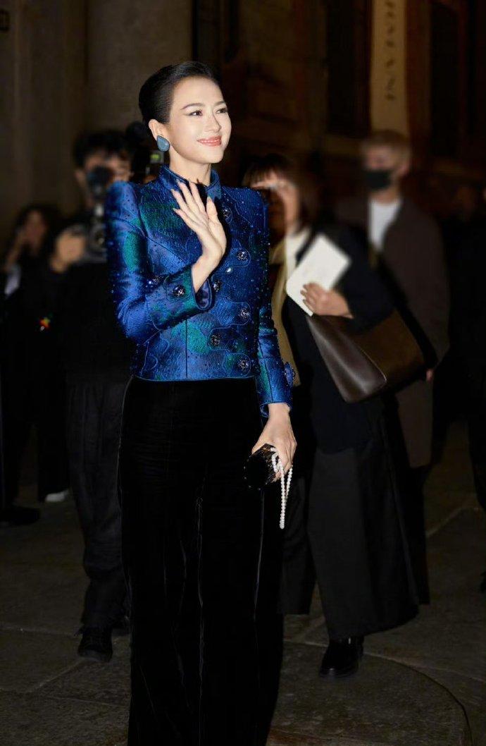 章子怡身穿Armani Privé 2025秋冬高訂藍綠色釘珠外套,中式企領設計融合西式剪裁,據悉是Armani生前最後一季高級訂製系列的開場款,兩人同框到場被安排同坐前排,一個被誇明豔大氣、一個被讚清俊挺拔,為東方面孔在時裝大騷增添話題。