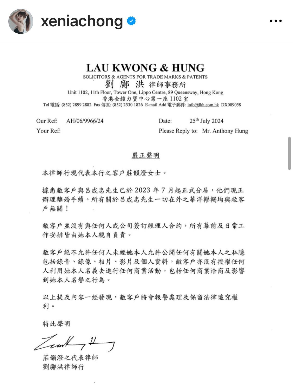 莊韻澄(Xenia)日前在IG貼出律師聲明,正跟呂成忠(Joe)辦理離婚手續。原來兩人在去年7月分居,聲明對方一切與她無關。Xenia亦表明未有跟任何人或公司簽經理人合約,不容許未經授權公開她的私隱和以她名字進行商業活動。