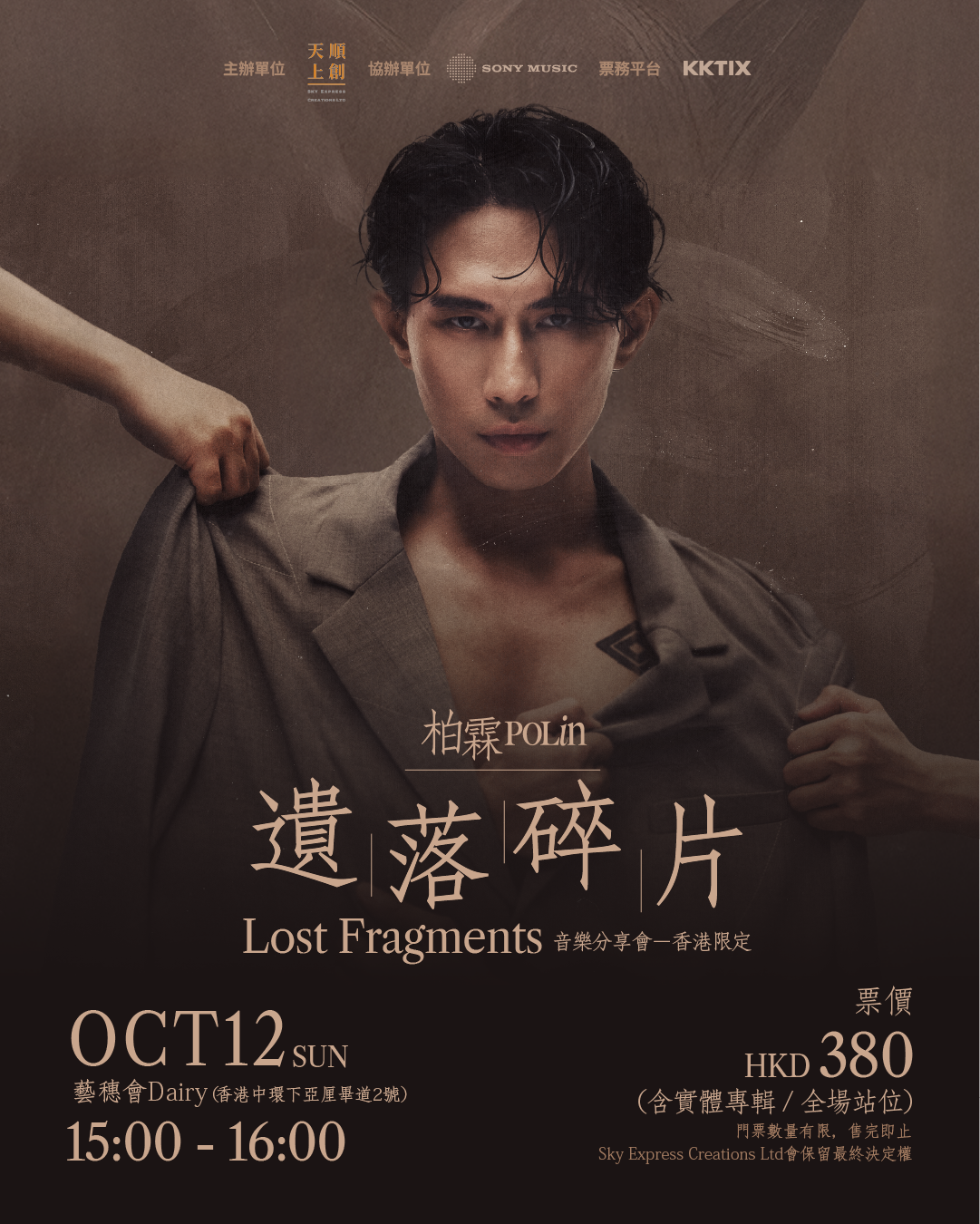華語男歌手柏霖PoLin憑全新創作專輯《允許萬物破碎》入圍「第36屆金曲獎最佳華語男歌手」,他將於10月12日下午3時在中環藝穗會Dairy舉行《遺落碎片Lost Fragments音樂分享會 - 香港限定》,這也是他首次來港跟歌迷零距離見面。屆時柏霖PoLin在這場限定分享會中透過每一首歌的創作故事和演唱動機,用歌與真實心聲帶你走進每一首作品的誕生片刻,認識他作為音樂人的靈魂與選擇。今次音樂分享會為全場站位, 特別福利為分享會後柏霖PoLin親手送上簽名海報活動,票價一律為$380 (含實體專輯),門票於KKTIX公開發售。