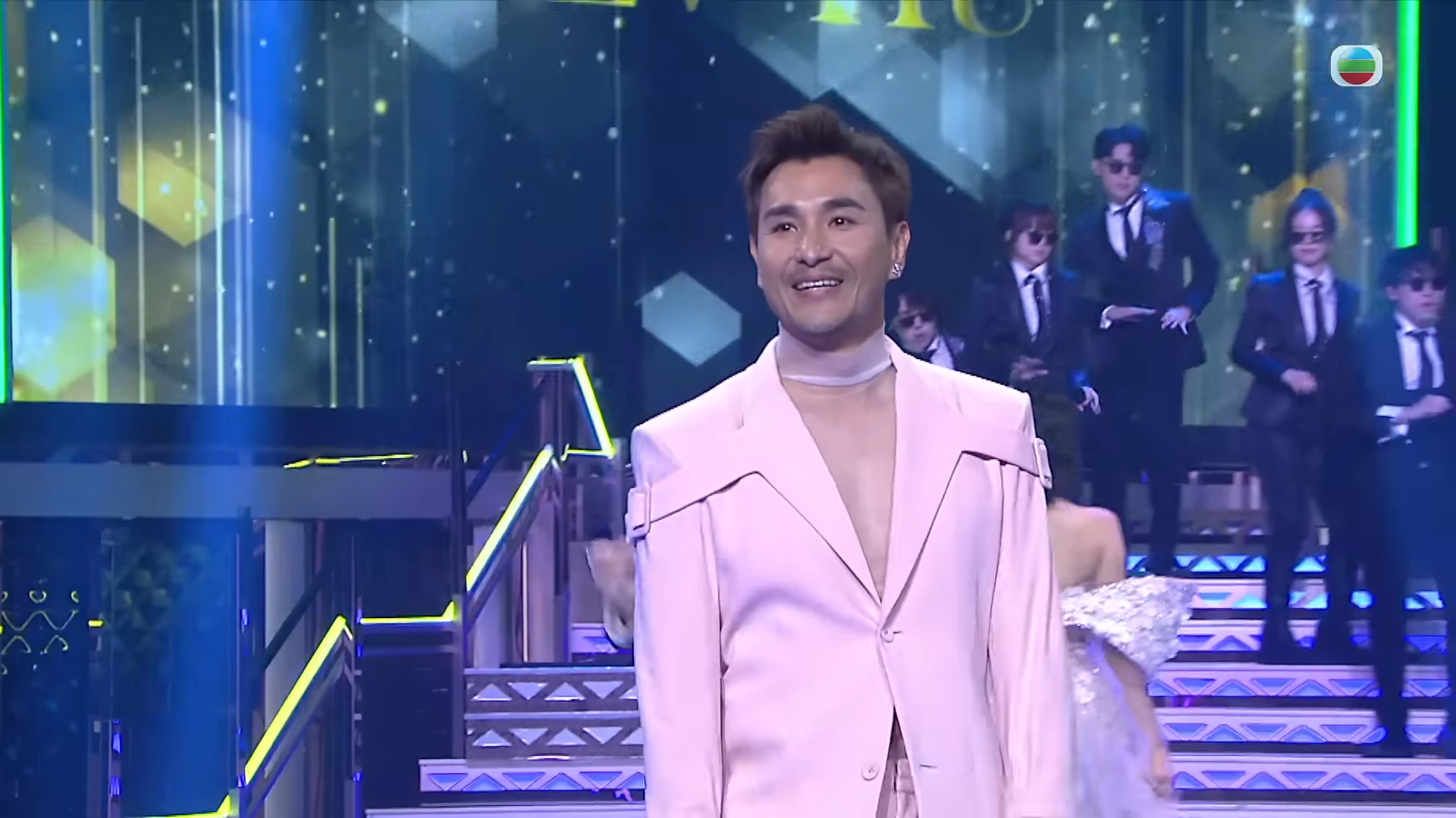 之後一個由TVB八生八旦主持的catwalk環節,除了有蕭正楠騷肌吸睛,陳展鵬換上本地設計師為他準備的粉紅色西裝,入面配上see thrrough衫。當他走到T字舞台時,更伸手入內再派出心心。