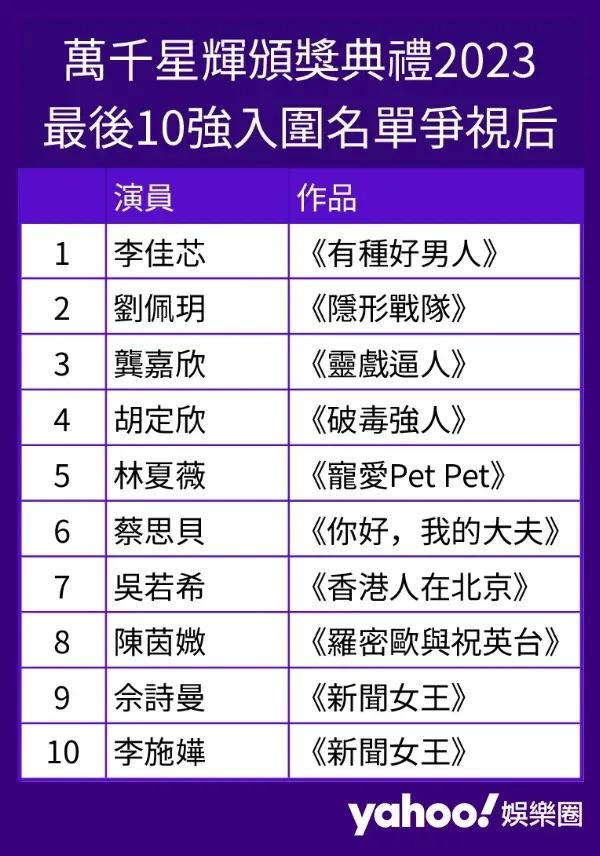 除咗視帝, 大熱《新聞女王》佘詩曼獲過半數人力撐三度封后,佔 52.5%(7,462人),大幅拋離第二位《有種好男人》李佳芯嘅 14.5%(2,064人)。睇嚟阿佘今次三度封后在望,連同早前喺TVB內地app「埋推推」顯示「大灣區最喜愛TVB女主角」走勢依然大幅拋離其他對手,阿佘會唔會同時拎埋「大灣區最喜愛TVB女主角」及「馬來西亞最喜愛TVB女主角」,成為今年「三料視后」呢,確實賽果要等到1月14日頒獎禮當日先知啦!