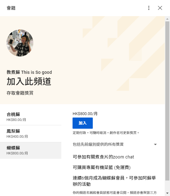 蘇施黃早前透露將會增設會員制,要看她煮食便要俾$400或$800一個月。