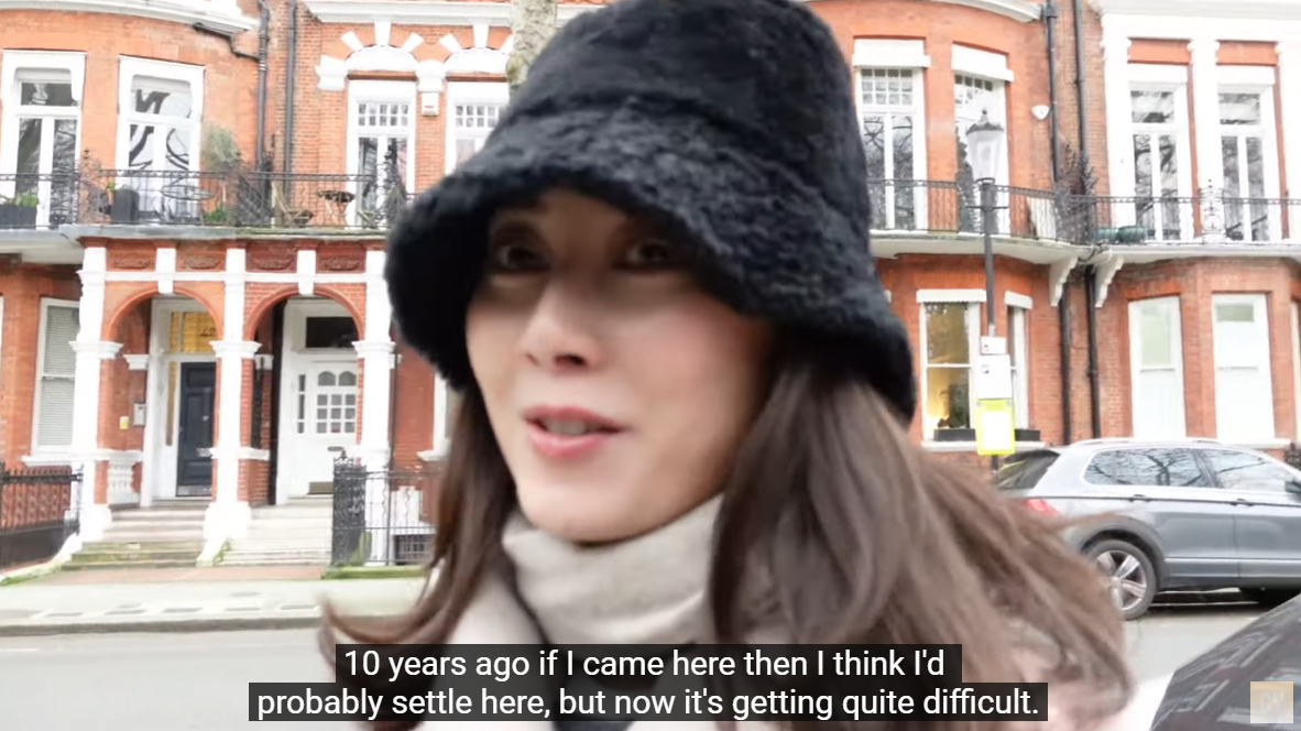 她在倫敦街上行走時,邊行邊說在香港看不到這樣的景色,每次見到這樣的環境,令她很想留下來。然而,她認為在倫敦的天氣令她更想念亞洲的氣候。她稱現時不是最好的時間在英國生活,如果自己早10年前來英國,可能會比較容易。
