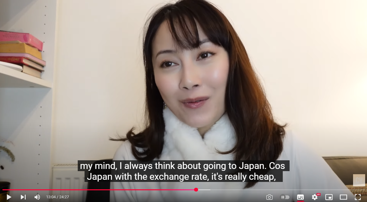 她又提到在英國出席不同派對時,大家都會盛裝打扮及配戴首飾,可惜治安問題,大家離場之後都會穿上大衣及隱藏首飾,她覺得這樣很無奈,因為自己很愛打扮,想靚靚的出街。她又提到在倫敦的生活指數很高,要付很多不同稅項,她稱自己不是很富有,因此在倫敦生活對她來說很吃力,自己更想過去日本生活。