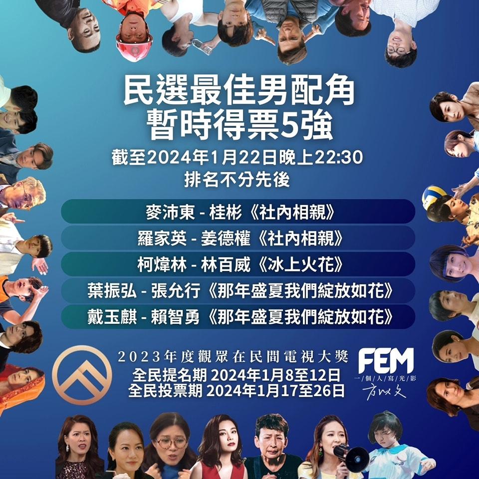 民選最佳男配角五強,全部由ViuTV製作的劇集暫時打入,包括(排名不分先後):麥沛東 的《社內相親》 桂彬、羅家英的姜德權、柯煒林的《冰上火花》林百威、葉振弘的《那年盛夏我們綻放如花》張允行、 戴玉麒 的賴智勇。