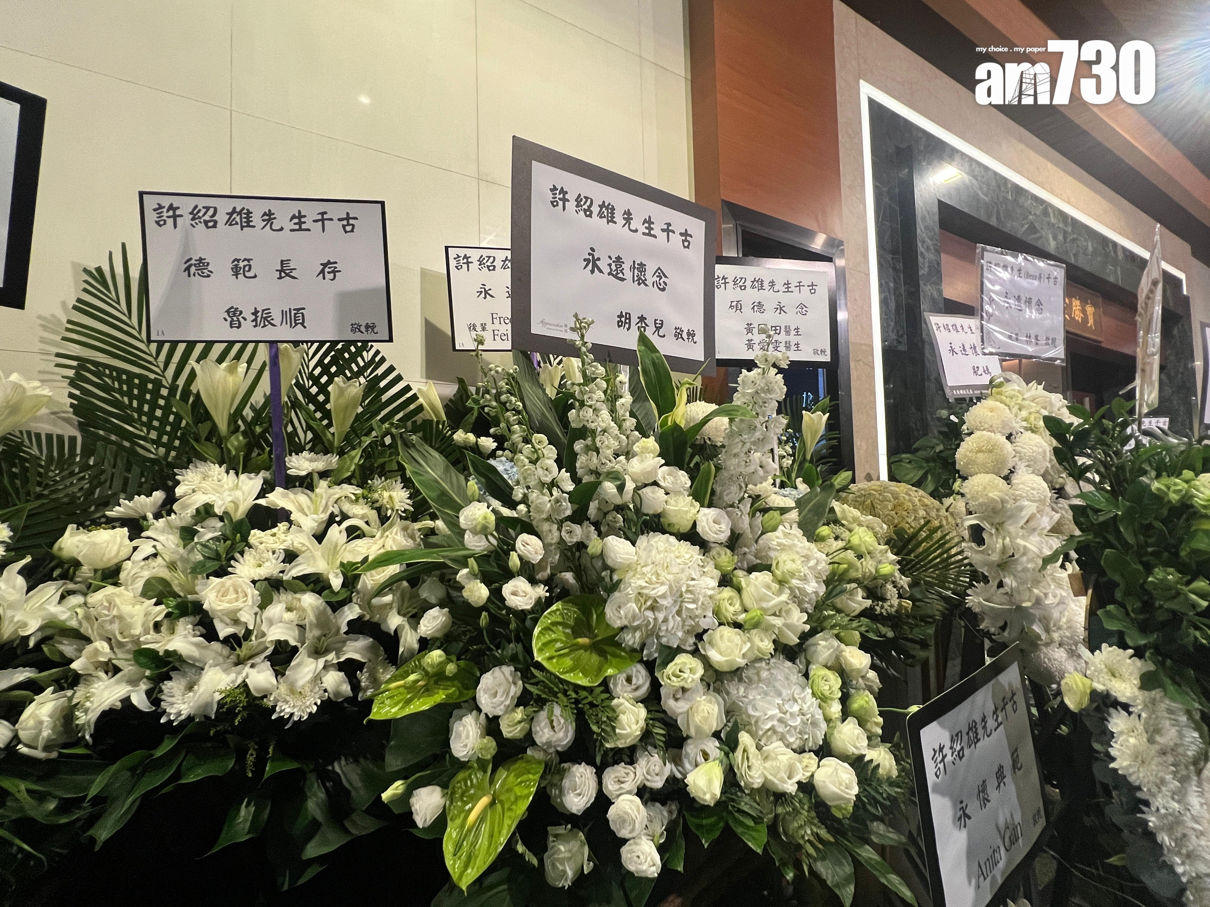 許紹雄家人於下午2時許到場打點,神情哀傷。許紹雄的遺照曝光相中的Benz雄戴著眼鏡微笑,身穿裇衫外套。靈堂內佈滿花牌和花圈,牌扁寫著「永遠懷念」,愛妻鳯子、獨生女許惠菁和繼子許俊貽的心形花圈放在正中央,愛妻鳳子送的花圈寫上「愛夫紹雄 永記恩情」,一對子女則以「親愛的父親 永遠懷念」致哀,祭文布則寫上「昊靝罔極」。契女佘詩曼的花牌放在許紹雄遺照附近當眼處,寫上「老豆千古 永遠懷念」。場內有4部電視播放許紹雄演藝生平的片段,包括獲頒最佳男配角、最受歡迎角色等獎項,以及曾參演劇集的照片和演員合照,讓致際人士緬懷悼念。