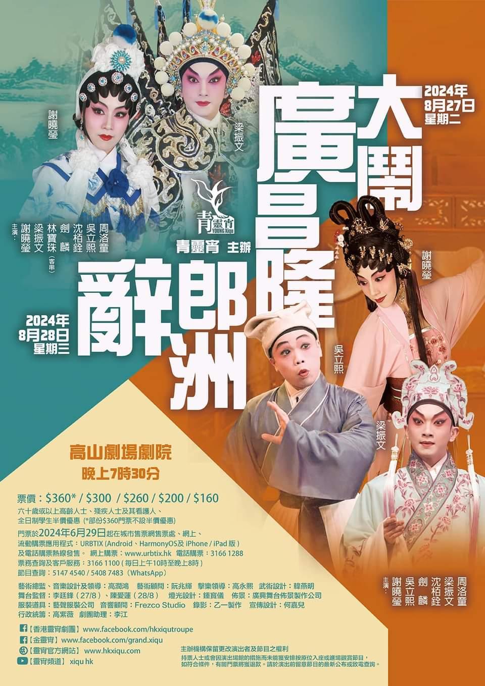 由謝曉瑩領班演出的三套粵劇︰《大鬧廣昌隆》、《辭郎洲》及《七夕》將於8月27日至29日一連三晚於高山劇場劇院上演。戲碼相當廣泛,適合一家大細作為開學前的輕鬆活動。